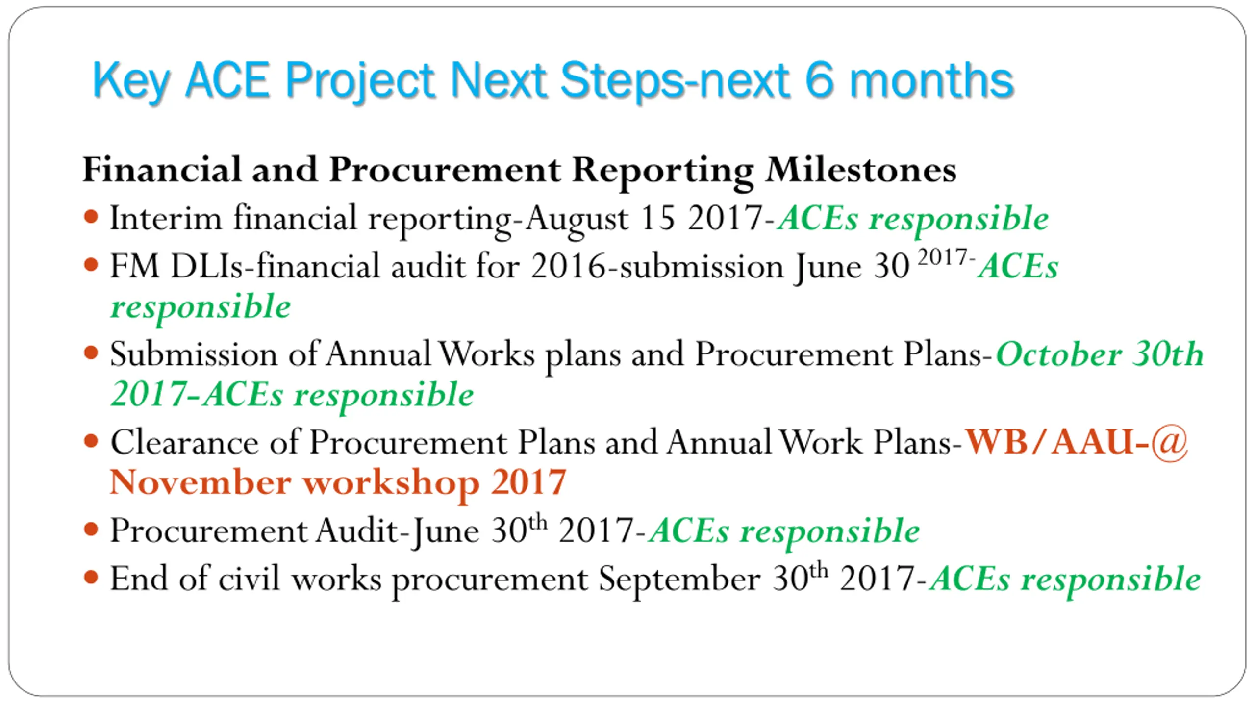 Key ACE Project Next Steps-next 6 months Financial and Procurement Reporting Milestones Interim financial reporting-August 15 2017-ACEs responsible FM DLIs-financial audit for 2016-submission June 302017-ACEs responsible Submission of Annual Works plans and Procurement Plans-October 30th 2017-ACEs responsible Clearance of Procurement Plans and Annual Work Plans-WB/AAU-@ November workshop 2017 Procurement Audit-June 30th2017-ACEs responsible End of civil works procurement September 30th2017-ACEs responsible