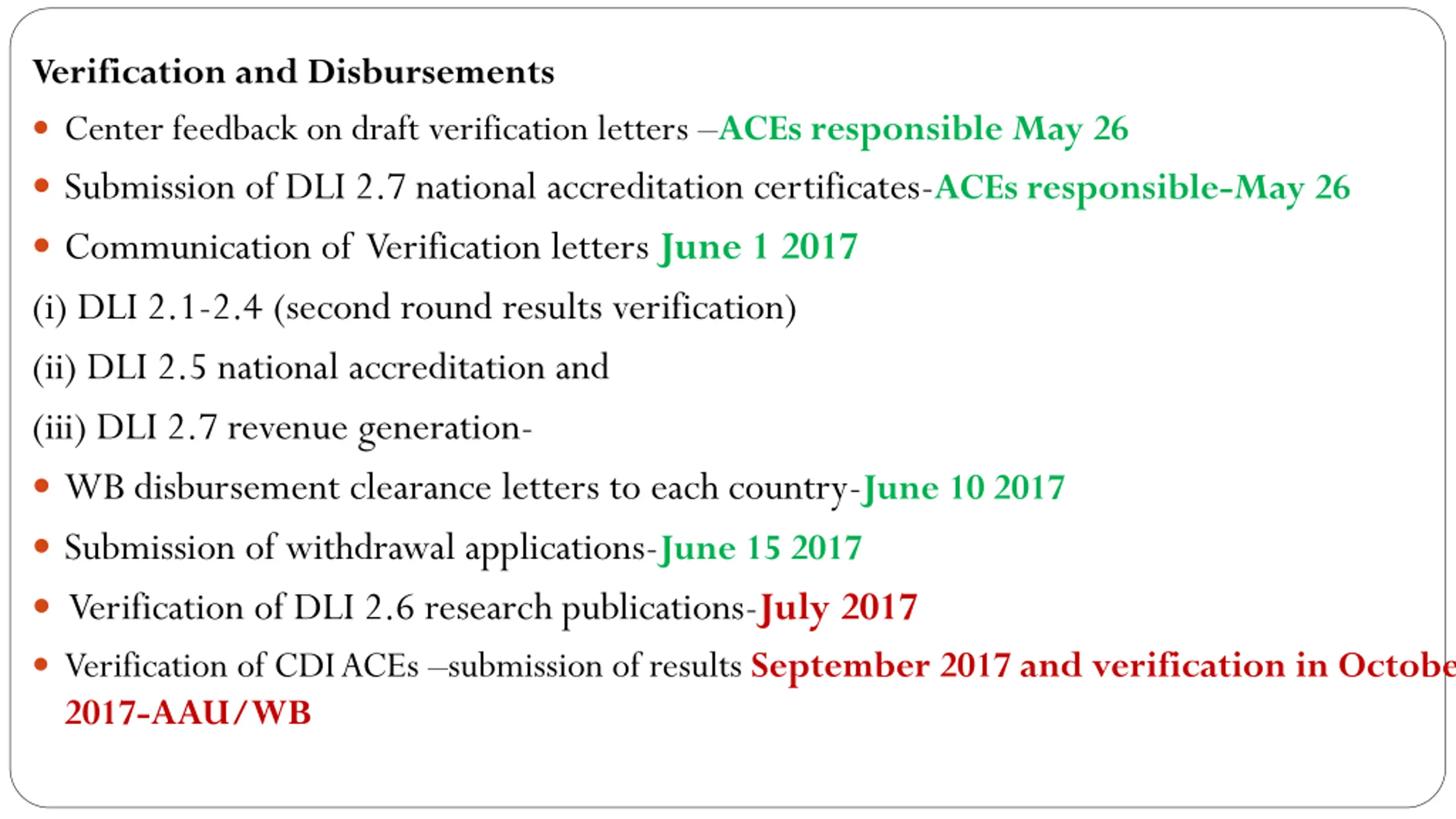 Verification and Disbursements Center feedback on draft verification letters ACEs responsible May 26 Submission of DLI 2.7 national accreditation certificates-ACEs responsible-May 26 Communication of Verification letters June 1 2017 (i) DLI 2.1-2.4 (second round results verification) (ii) DLI 2.5 national accreditation and (iii) DLI 2.7 revenue generation- WB disbursement clearance letters to each country-June 10 2017 Submission of withdrawal applications-June 15 2017 Verification of DLI 2.6 research publications-July 2017 Verification of CDI ACEs submission of results September 2017 and verification in October 2017-AAU/WB