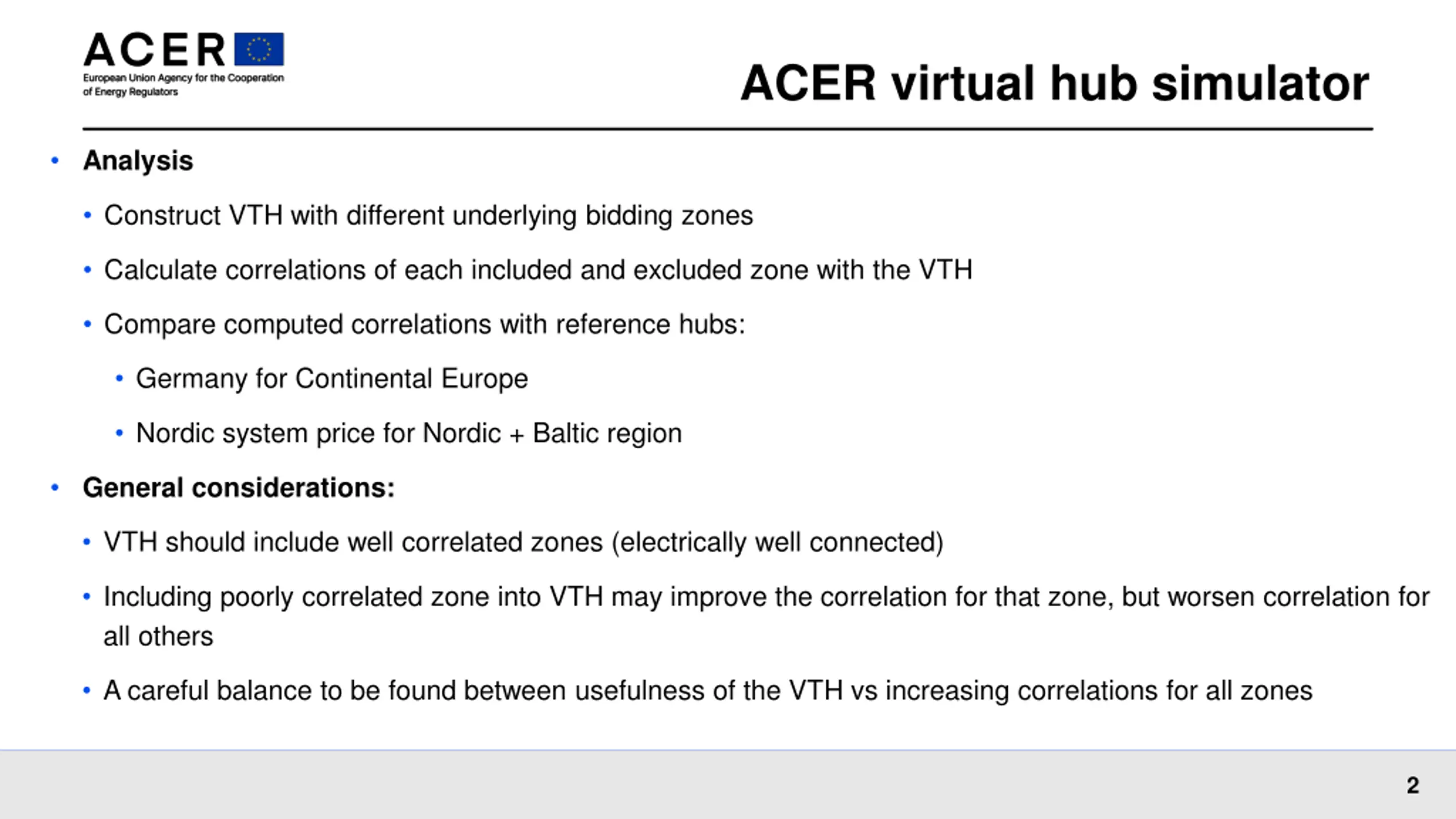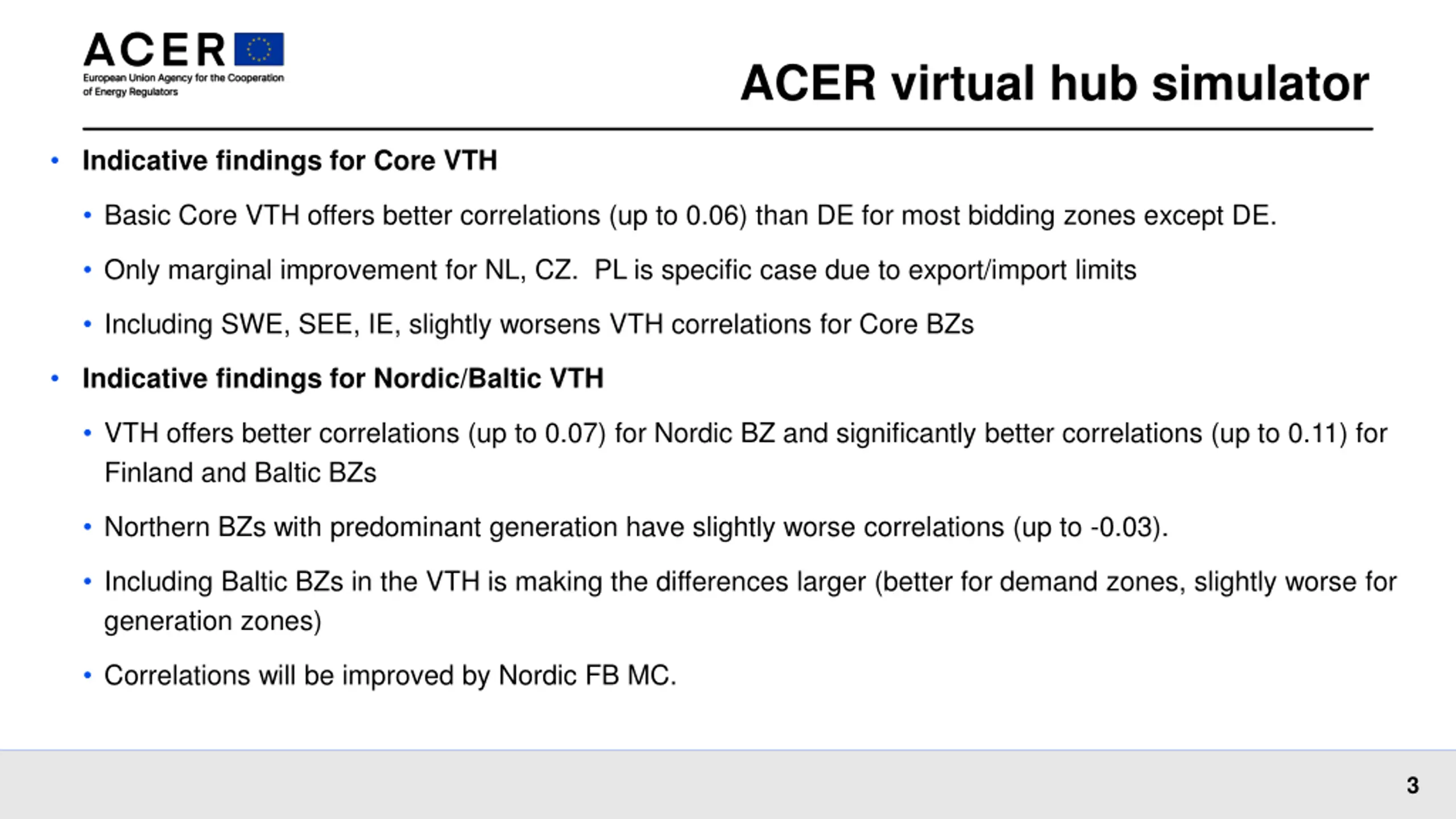 ACER virtual hub simulator Analysis Construct VTH with different underlying bidding zones Calculate correlations of each included and excluded zone with the VTH Compare computed correlations with reference hubs: Germany for Continental Europe Nordic system price for Nordic + Baltic region General considerations: VTH should include well correlated zones (electrically well connected) Including poorly correlated zone into VTH may improve the correlation for that zone, but worsen correlation for all others A careful balance to be found between usefulness of the VTH vs increasing correlations for all zones 2