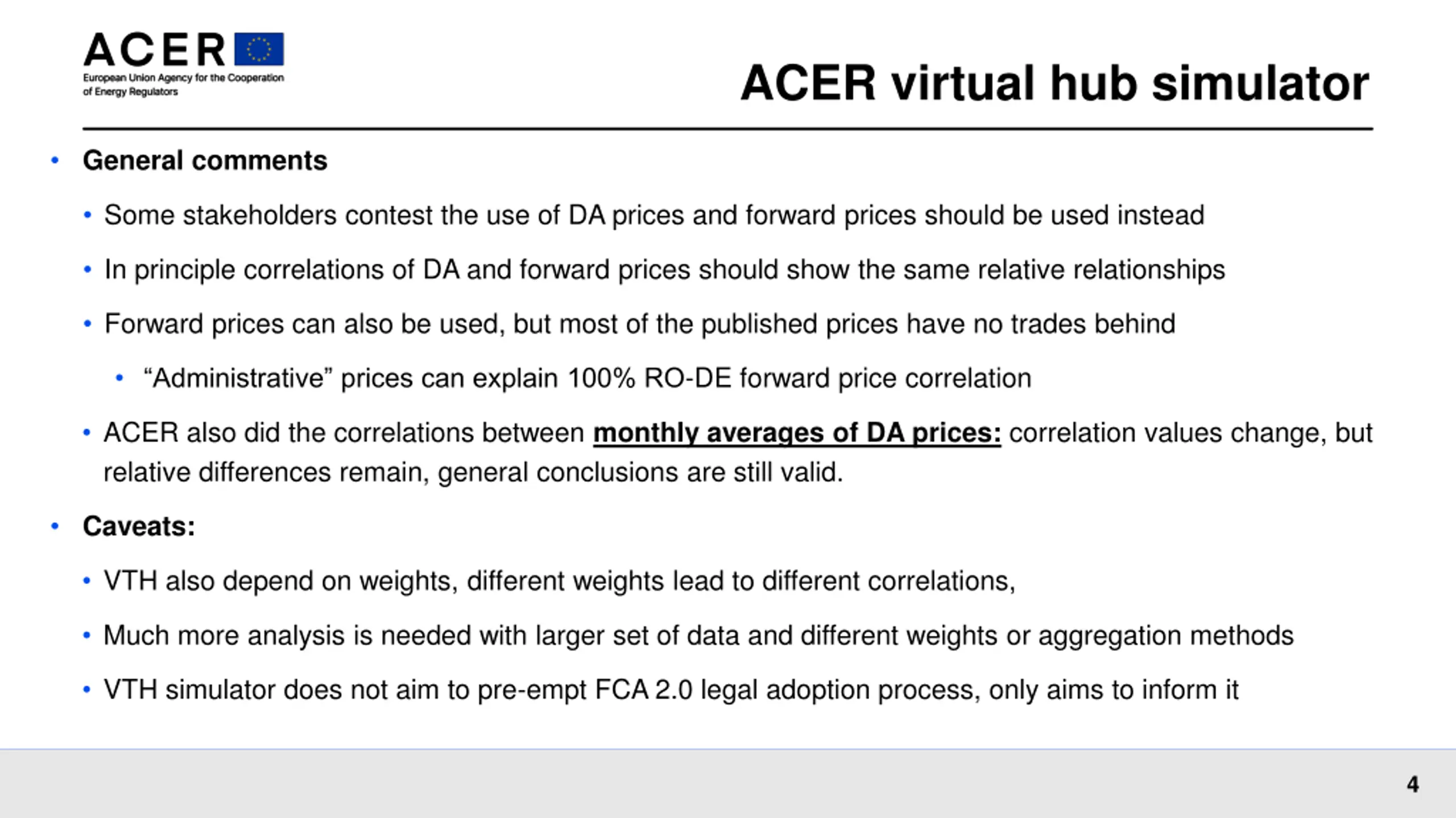 ACER virtual hub simulator Indicative findings for Core VTH Basic Core VTH offers better correlations (up to 0.06) than DE for most bidding zones except DE. Only marginal improvement for NL, CZ. PL is specific case due to export/import limits Including SWE, SEE, IE, slightly worsens VTH correlations for Core BZs Indicative findings for Nordic/Baltic VTH VTH offers better correlations (up to 0.07) for Nordic BZ and significantly better correlations (up to 0.11) for Finland and Baltic BZs Northern BZs with predominant generation have slightly worse correlations (up to -0.03). Including Baltic BZs in the VTH is making the differences larger (better for demand zones, slightly worse for generation zones) Correlations will be improved by Nordic FB MC. 3