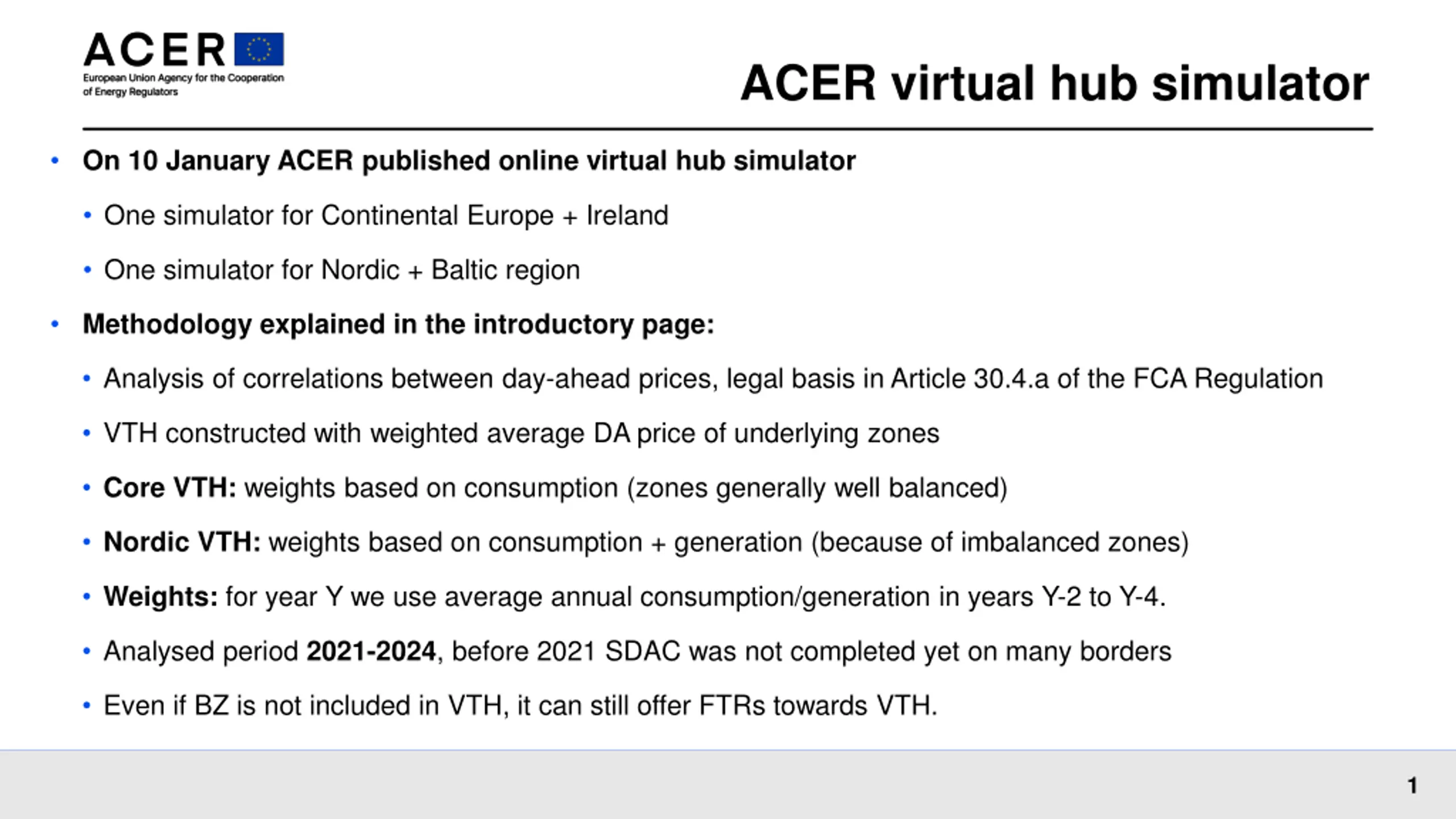 ACER virtual hub simulator On 10 January ACER published online virtual hub simulator One simulator for Continental Europe + Ireland One simulator for Nordic + Baltic region Methodology explained in the introductory page: Analysis of correlations between day-ahead prices, legal basis in Article 30.4.a of the FCA Regulation VTH constructed with weighted average DA price of underlying zones Core VTH: weights based on consumption (zones generally well balanced) Nordic VTH: weights based on consumption + generation (because of imbalanced zones) Weights: for year Y we use average annual consumption/generation in years Y-2 to Y-4. Analysed period 2021-2024, before 2021 SDAC was not completed yet on many borders Even if BZ is not included in VTH, it can still offer FTRs towards VTH. 1