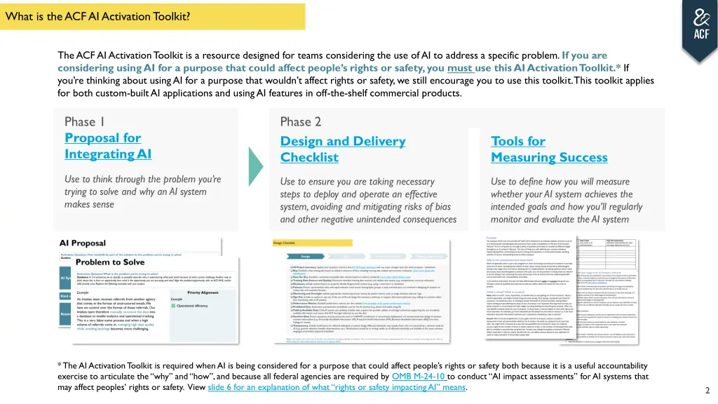 What is the ACF AI Activation Toolkit? The ACF AI Activation Toolkit is a resource designed for teams considering the use of AI to address a specific problem. If you are considering using AI for a purpose that could affect people s rights or safety, you must use this AI Activation Toolkit.* If you re thinking about using AI for a purpose that wouldn t affect rights or safety, we still encourage you to use this toolkit. This toolkit applies for both custom-built AI applications and using AI features in off-the-shelf commercial products. Phase 1 Proposal for Integrating AI Phase 2 Design and Delivery Checklist Tools for Measuring Success Use to think through the problem you re trying to solve and why an AI system makes sense Use to ensure you are taking necessary steps to deploy and operate an effective system, avoiding and mitigating risks of bias and other negative unintended consequences Use to define how you will measure whether your AI system achieves the intended goals and how you ll regularly monitor and evaluate the AI system * The AI Activation Toolkit is required when AI is being considered for a purpose that could affect people s rights or safety both because it is a useful accountability exercise to articulate the why and how , and because all federal agencies are required by OMB M-24-10 to conduct AI impact assessments for AI systems that may affect peoples rights or safety. View slide 6 for an explanation of what rights or safety impacting AI means. 2