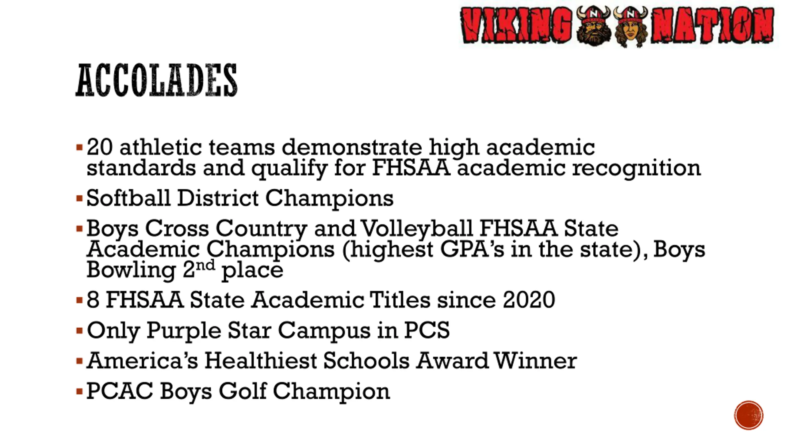 ACCOLADES 20 athletic teams demonstrate high academic standards and qualify for FHSAA academic recognition Softball District Champions Boys Cross Country and Volleyball FHSAA State Academic Champions (highest GPA s in the state), Boys Bowling 2nd place 8 FHSAA State Academic Titles since 2020 Only Purple Star Campus in PCS America s Healthiest Schools Award Winner PCAC Boys Golf Champion