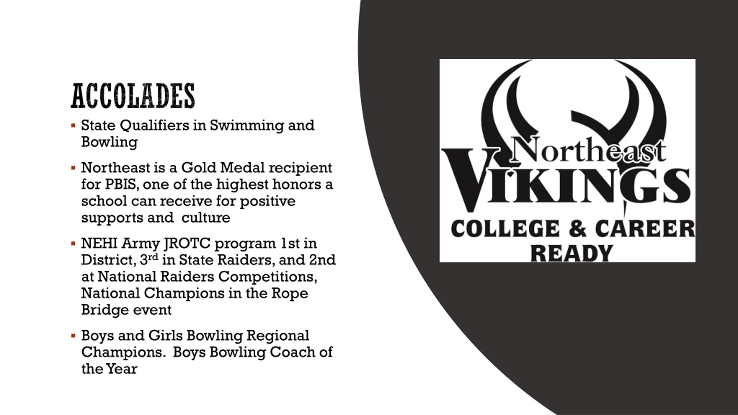 ACCOLADES State Qualifiers in Swimming and Bowling Northeast is a Gold Medal recipient for PBIS, one of the highest honors a school can receive for positive supports and culture NEHI Army JROTC program 1st in District, 3rd in State Raiders, and 2nd at National Raiders Competitions, National Champions in the Rope Bridge event Boys and Girls Bowling Regional Champions. Boys Bowling Coach of the Year
