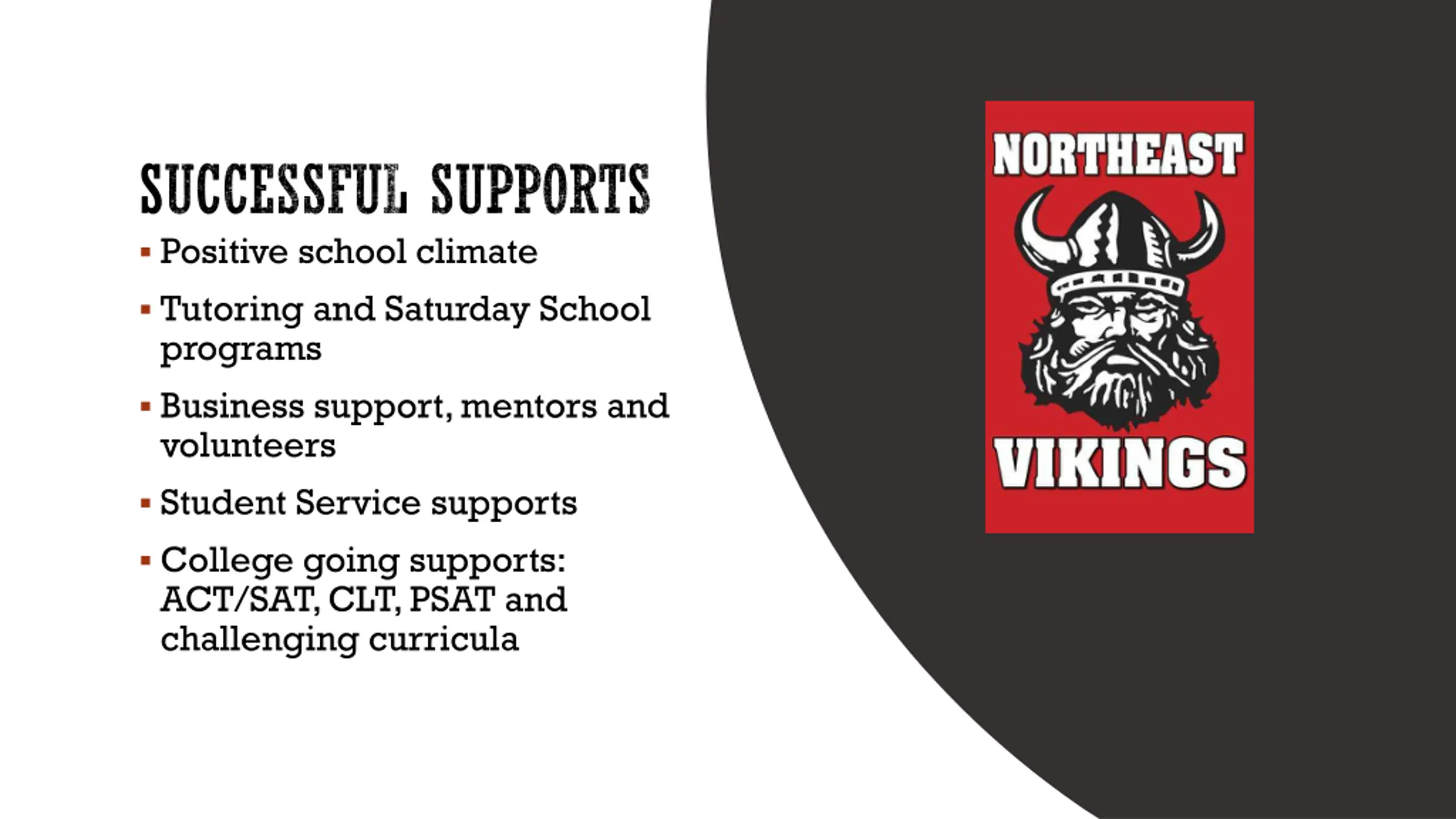 SUCCESSFUL SUPPORTS Positive school climate Tutoring and Saturday School programs Business support, mentors and volunteers Student Service supports College going supports: ACT/SAT, CLT, PSAT and challenging curricula