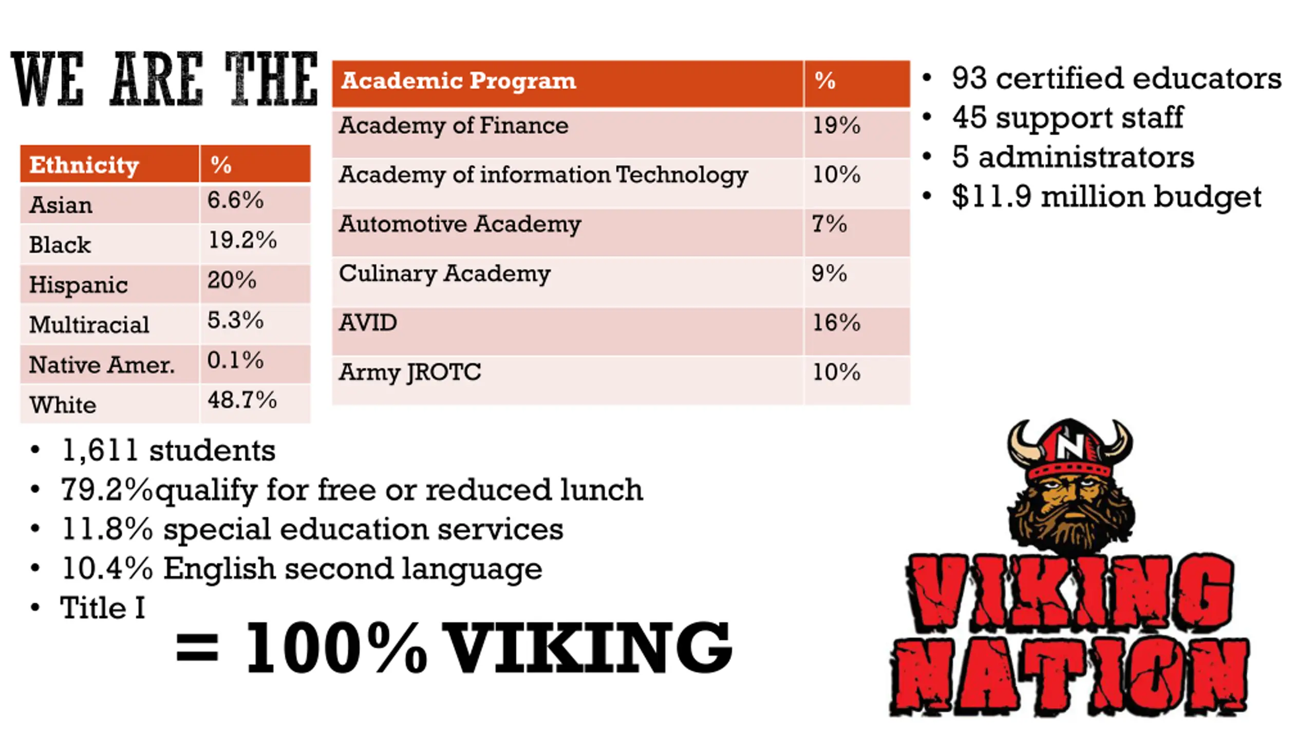 WE ARE THE 93 certified educators 45 support staff 5 administrators $11.9 million budget Academic Program % Academy of Finance 19% Ethnicity Asian Black Hispanic Multiracial Native Amer. White 1,611 students 79.2%qualify for free or reduced lunch 11.8% special education services 10.4% English second language Title I= 100% VIKING % 6.6% 19.2% 20% 5.3% 0.1% 48.7% Academy of information Technology 10% Automotive Academy 7% Culinary Academy 9% AVID 16% Army JROTC 10%