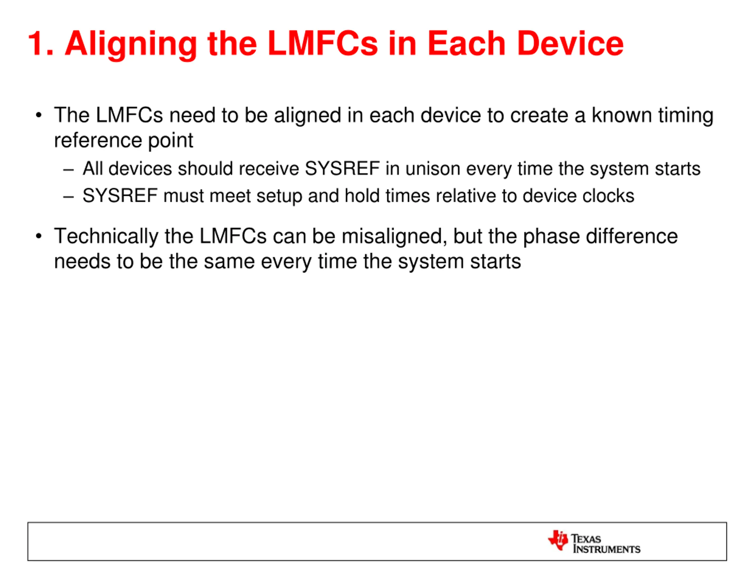 1. Aligning the LMFCs in Each Device The LMFCs need to be aligned in each device to create a known timing reference point All devices should receive SYSREF in unison every time the system starts SYSREF must meet setup and hold times relative to device clocks Technically the LMFCs can be misaligned, but the phase difference needs to be the same every time the system starts