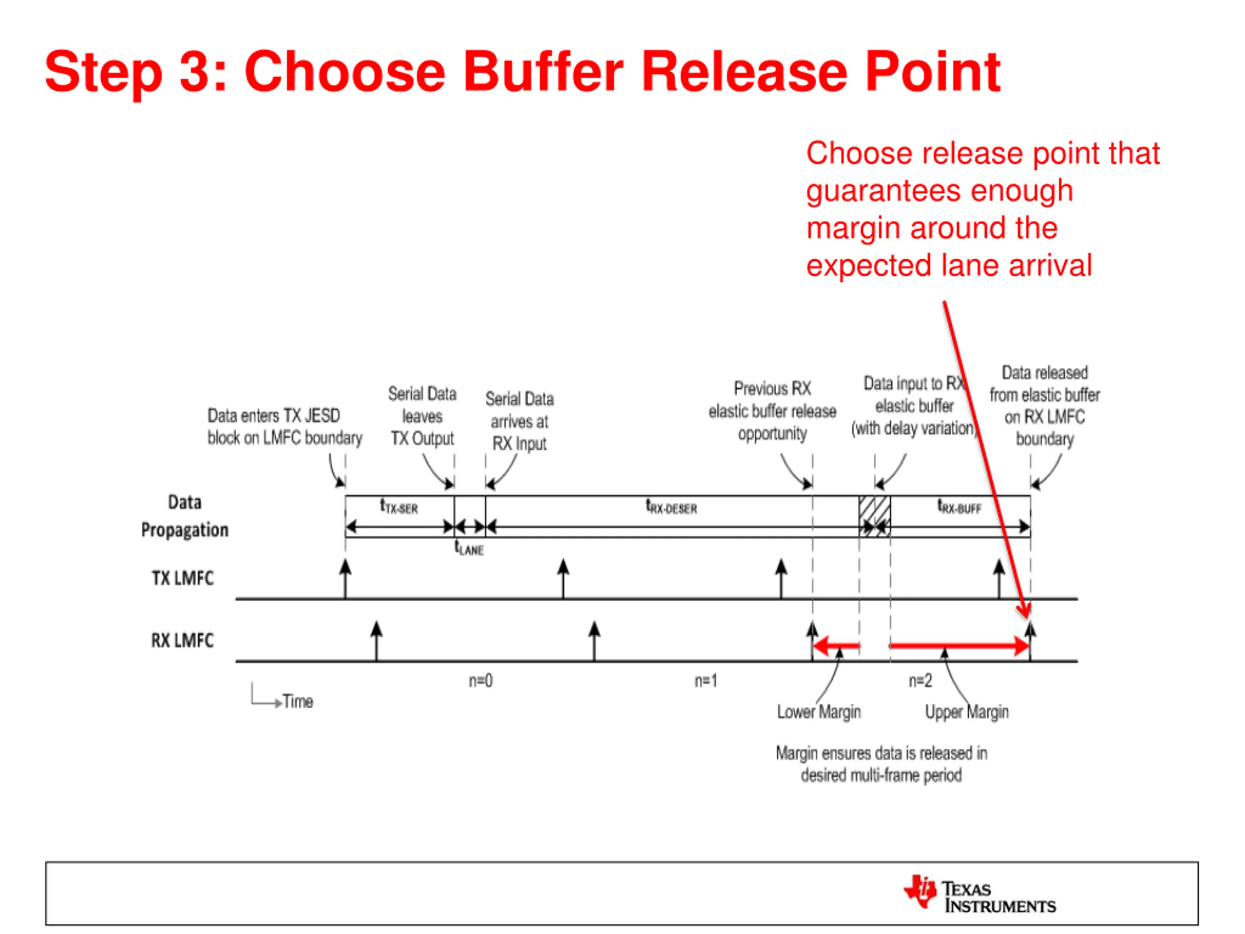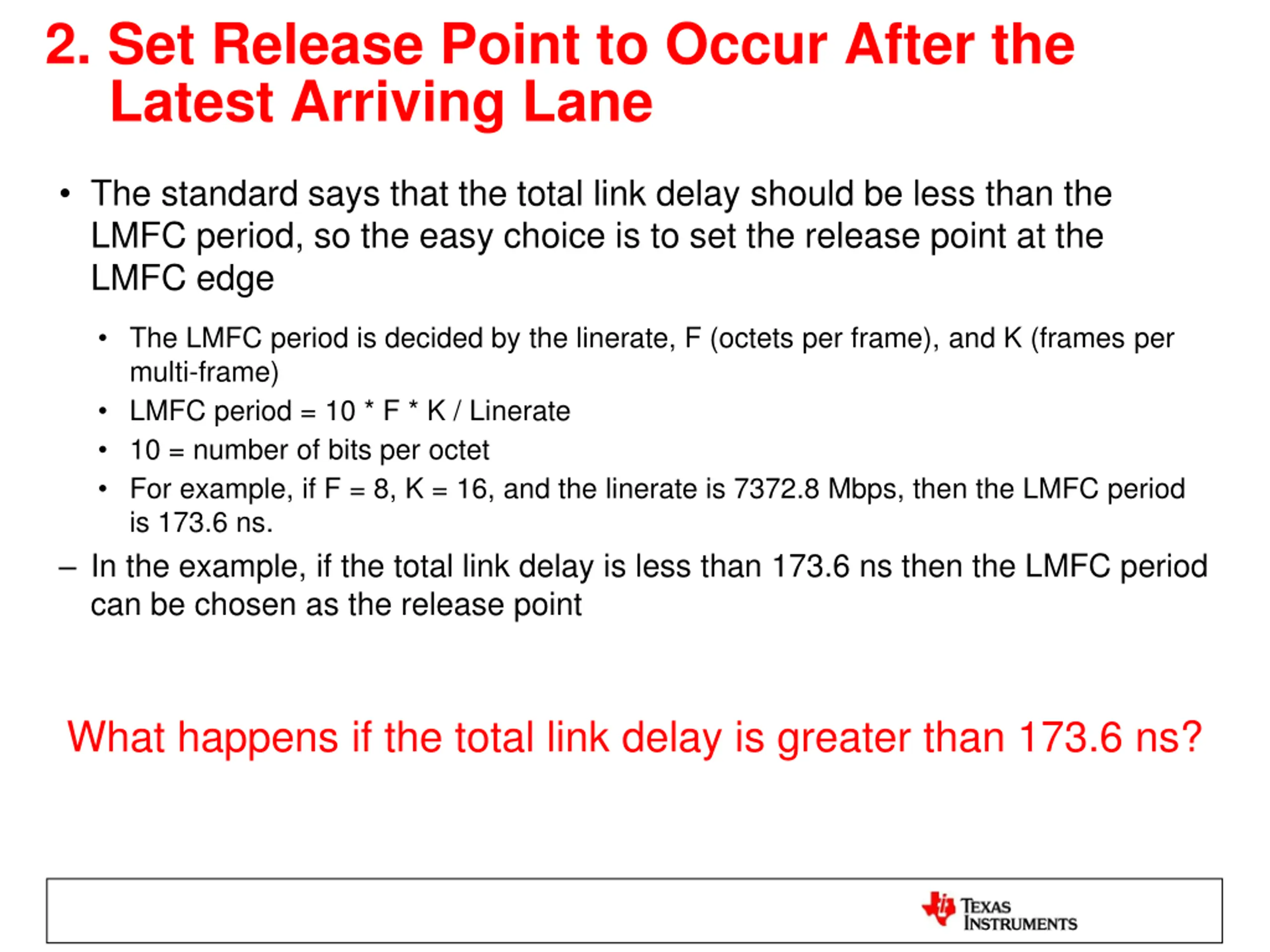 2. Set Release Point to Occur After the Latest Arriving Lane The standard says that the total link delay should be less than the LMFC period, so the easy choice is to set the release point at the LMFC edge The LMFC period is decided by the linerate, F (octets per frame), and K (frames per multi-frame) LMFC period = 10 * F * K / Linerate 10 = number of bits per octet For example, if F = 8, K = 16, and the linerate is 7372.8 Mbps, then the LMFC period is 173.6 ns. In the example, if the total link delay is less than 173.6 ns then the LMFC period can be chosen as the release point What happens if the total link delay is greater than 173.6 ns?