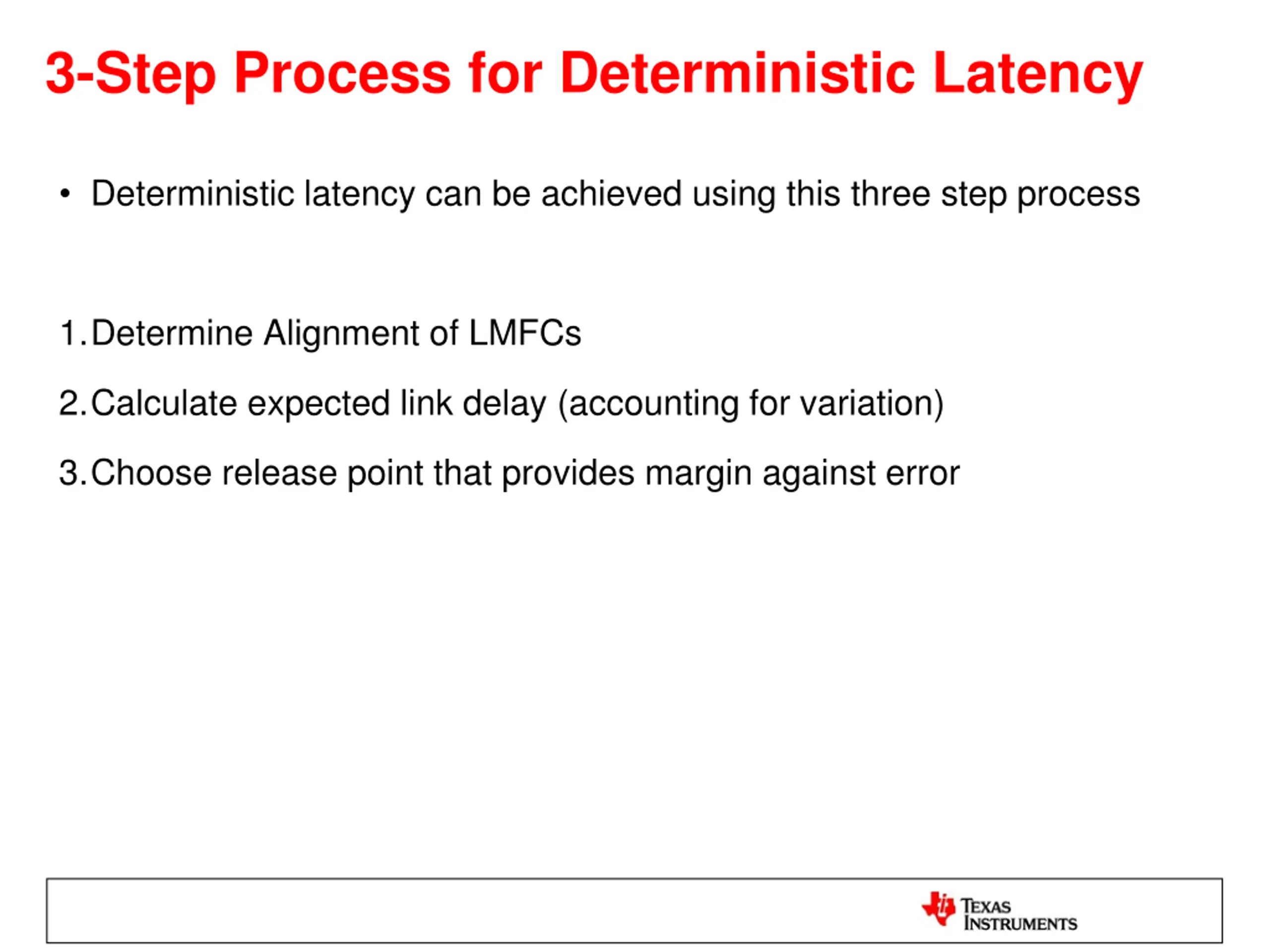 3-Step Process for Deterministic Latency Deterministic latency can be achieved using this three step process 1.Determine Alignment of LMFCs 2.Calculate expected link delay (accounting for variation) 3.Choose release point that provides margin against error
