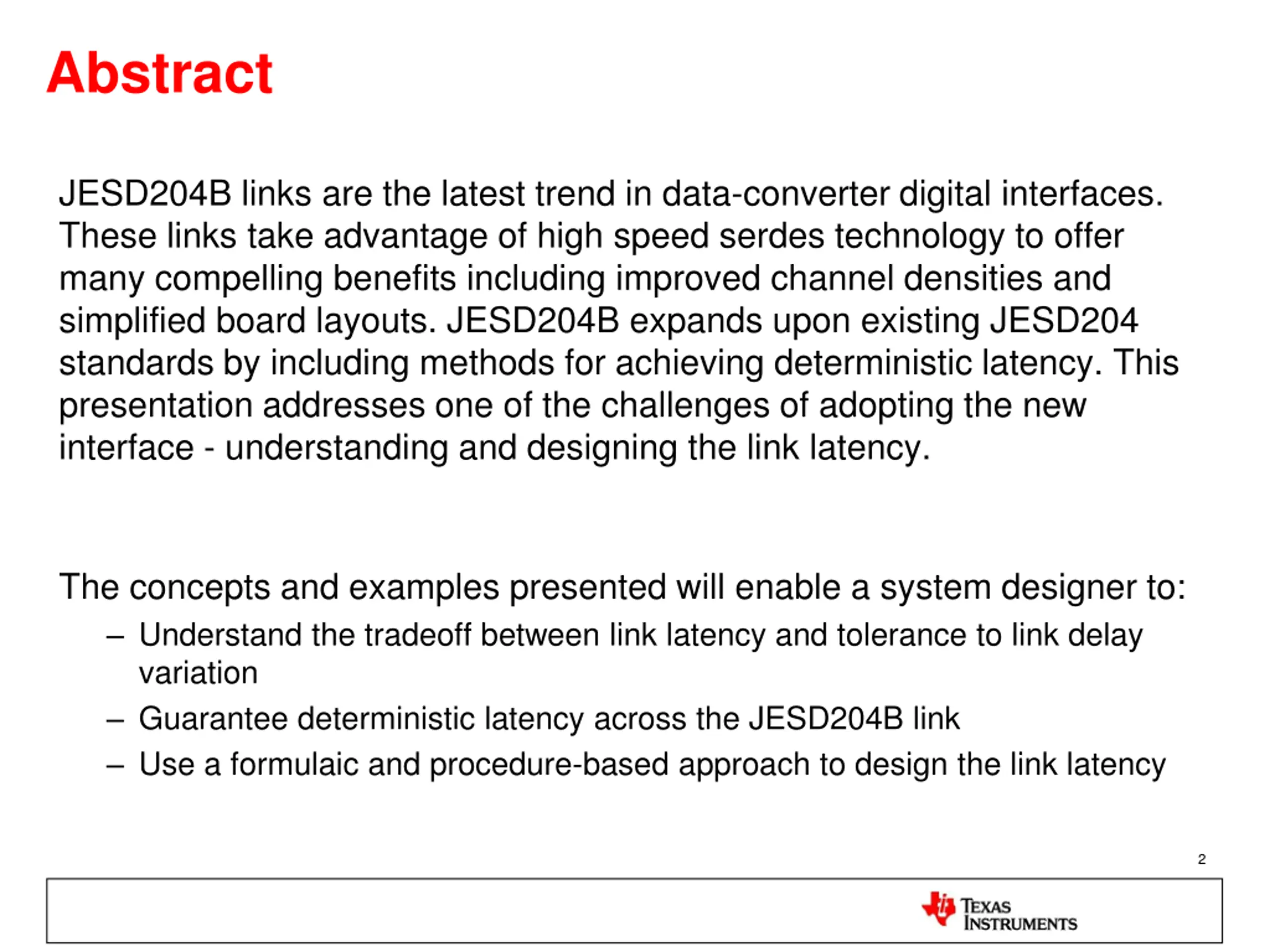 Abstract JESD204B links are the latest trend in data-converter digital interfaces. These links take advantage of high speed serdes technology to offer many compelling benefits including improved channel densities and simplified board layouts. JESD204B expands upon existing JESD204 standards by including methods for achieving deterministic latency. This presentation addresses one of the challenges of adopting the new interface - understanding and designing the link latency. The concepts and examples presented will enable a system designer to: Understand the tradeoff between link latency and tolerance to link delay variation Guarantee deterministic latency across the JESD204B link Use a formulaic and procedure-based approach to design the link latency 2