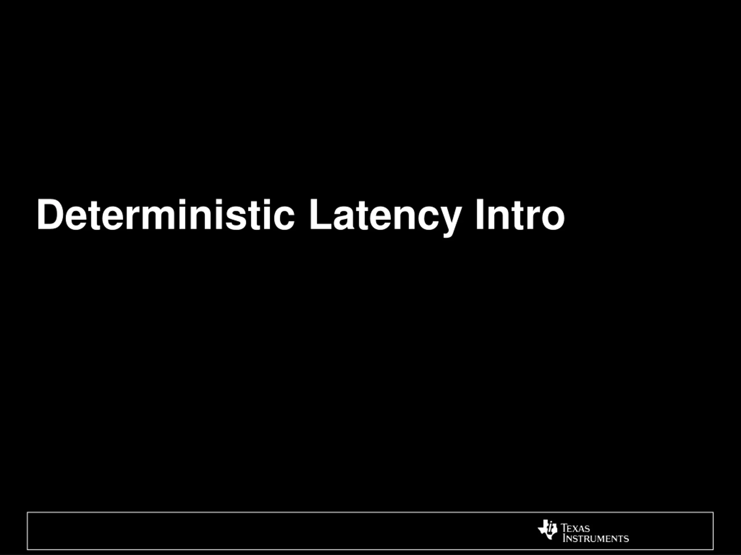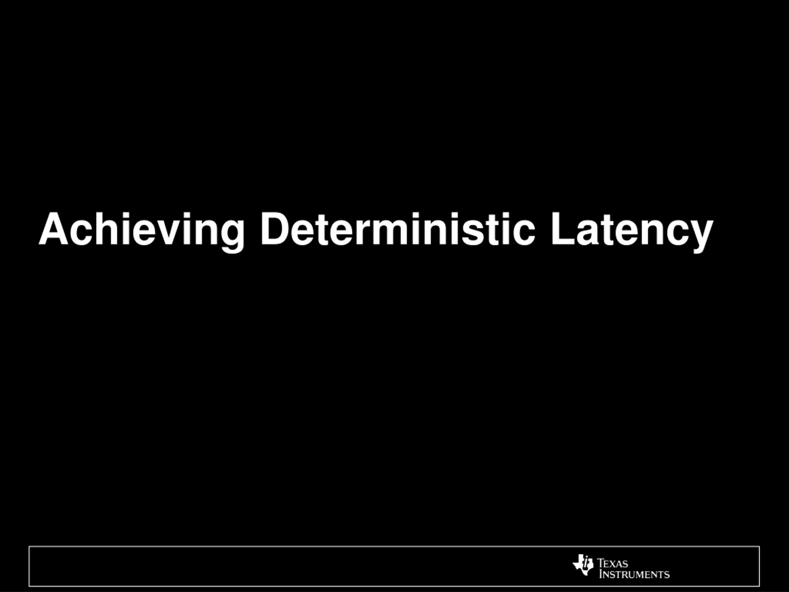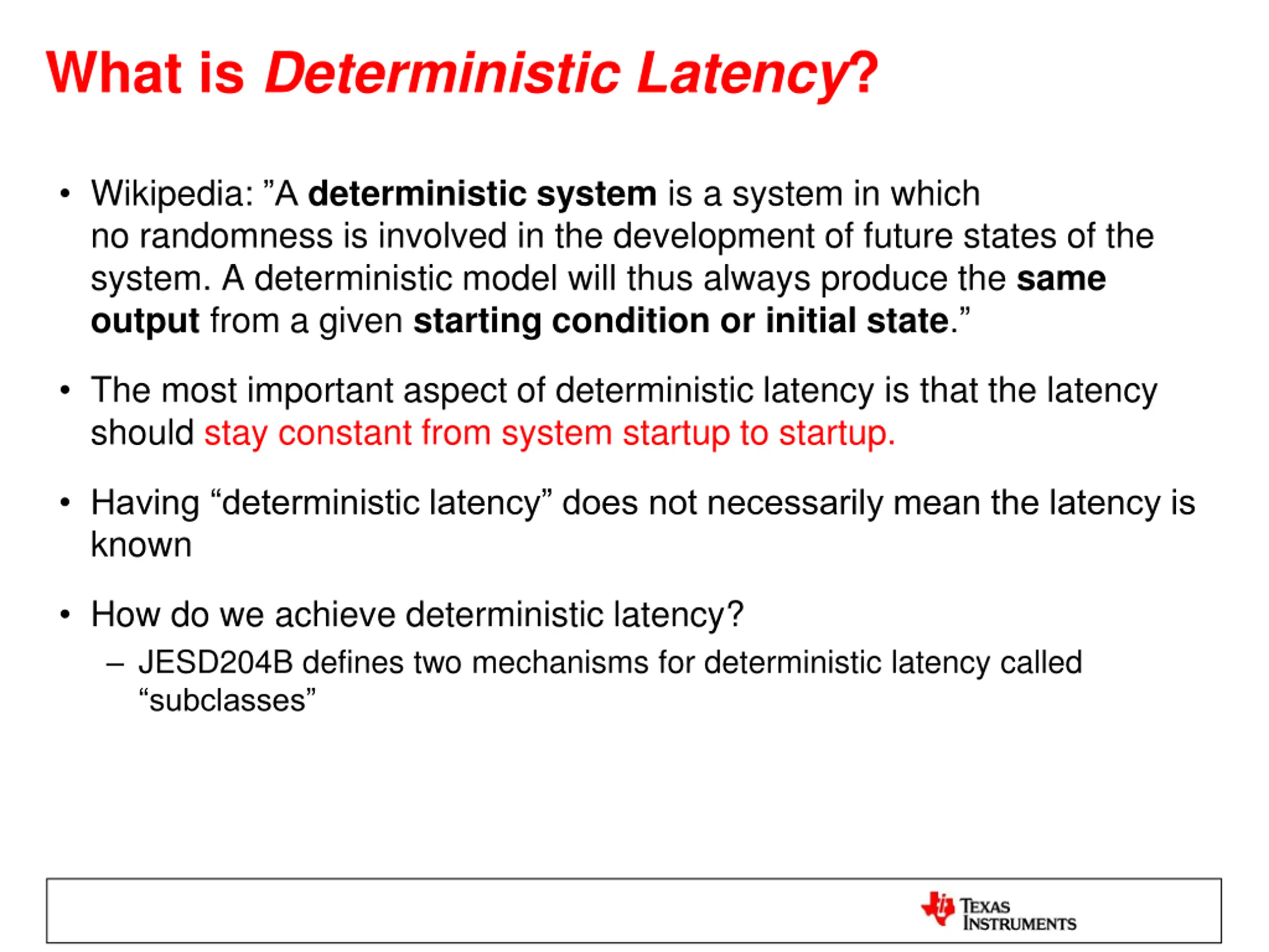 What is Deterministic Latency? Wikipedia: A deterministic system is a system in which no randomness is involved in the development of future states of the system. A deterministic model will thus always produce the same output from a given starting condition or initial state. The most important aspect of deterministic latency is that the latency should stay constant from system startup to startup. Having deterministic latency does not necessarily mean the latency is known How do we achieve deterministic latency? JESD204B defines two mechanisms for deterministic latency called subclasses