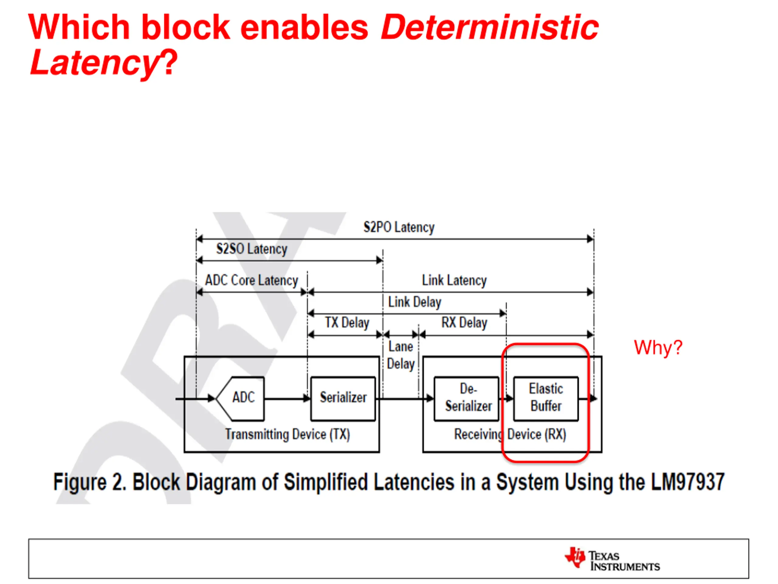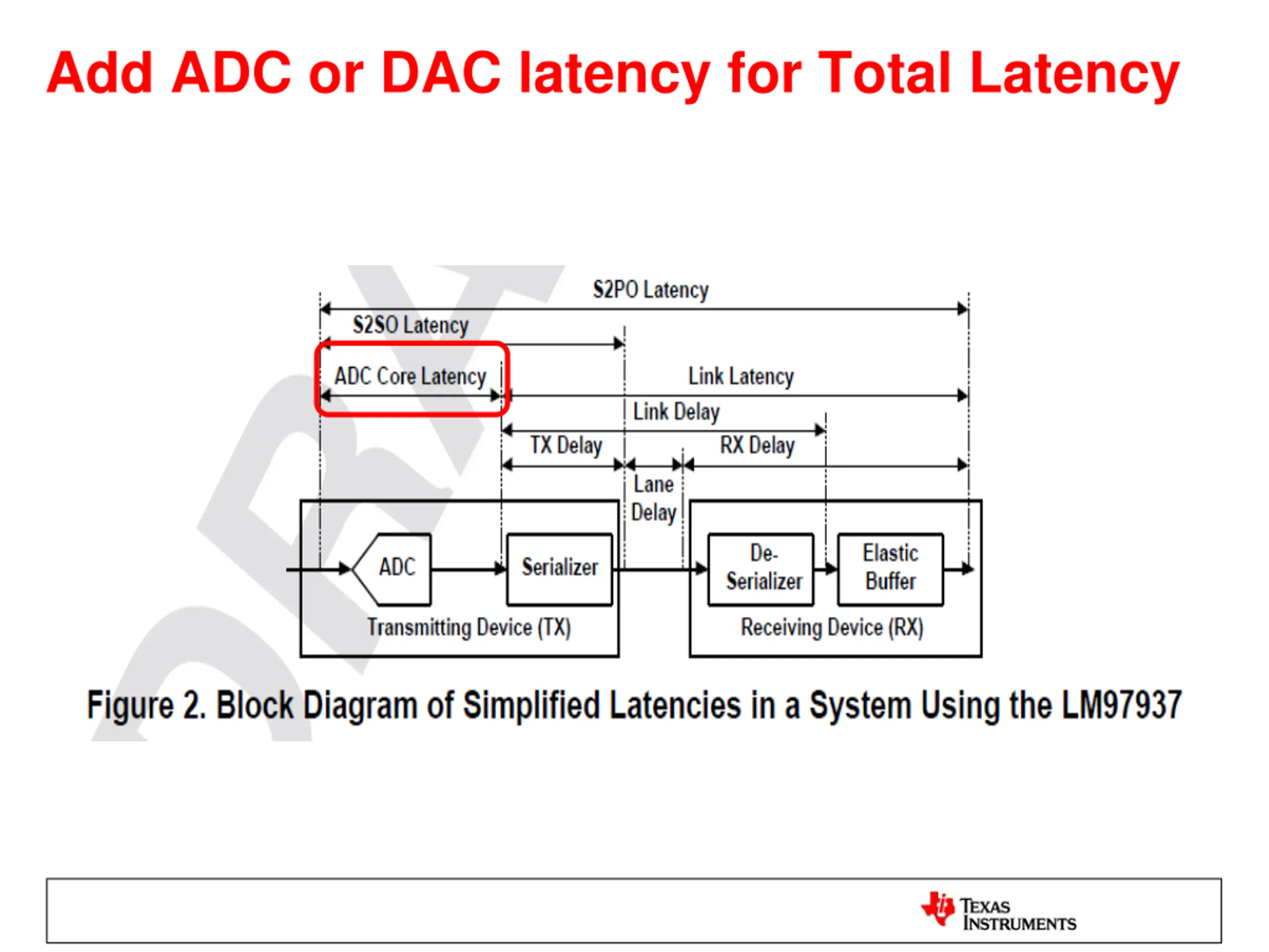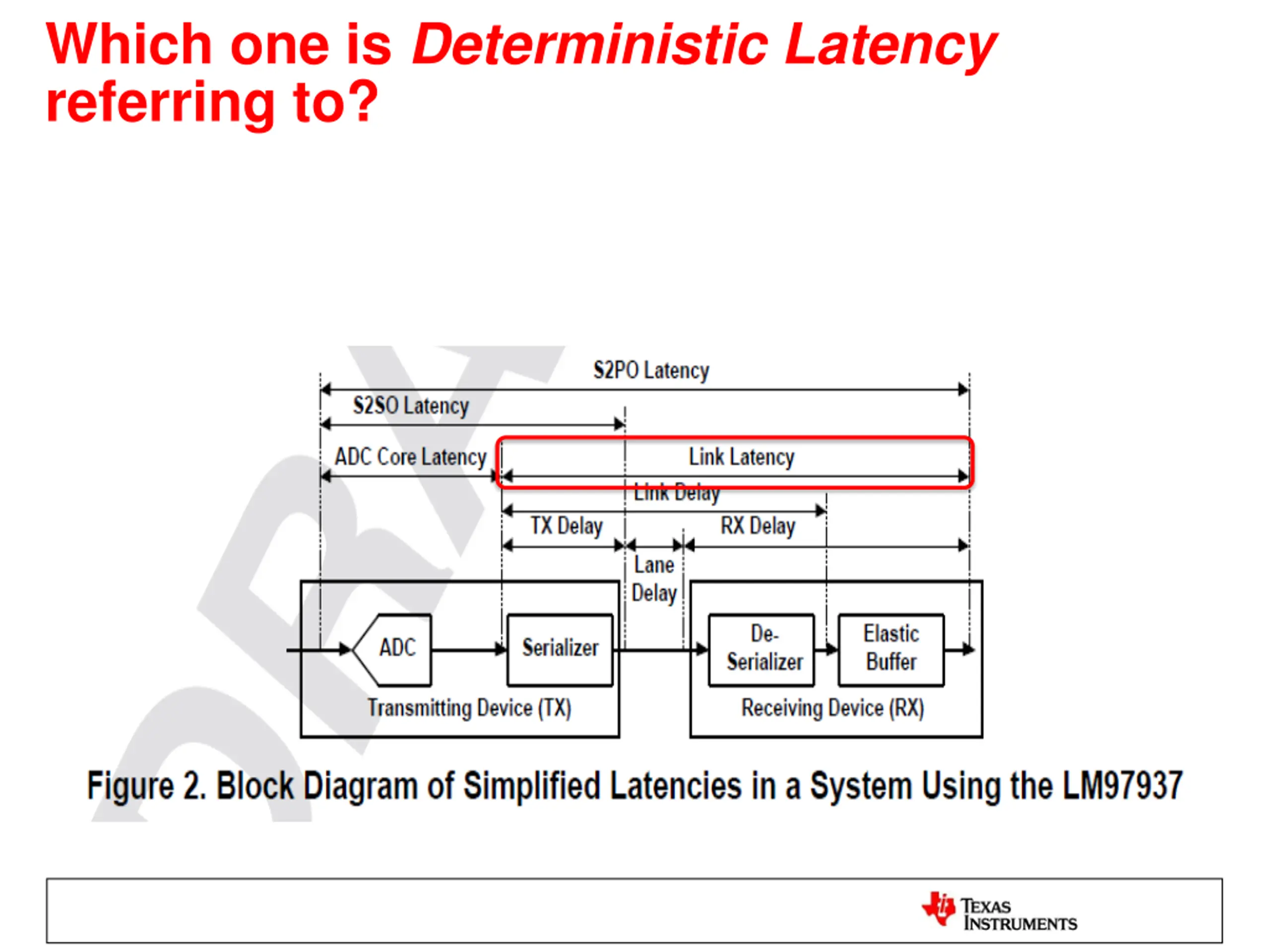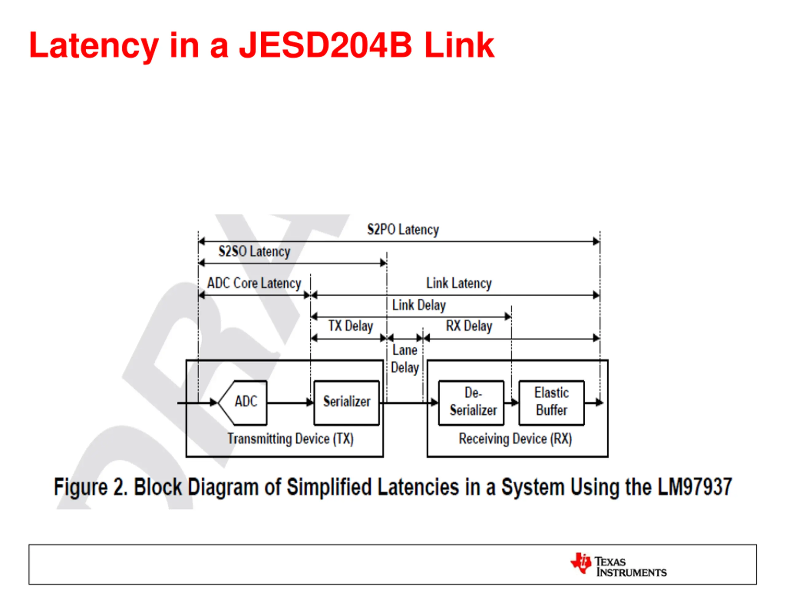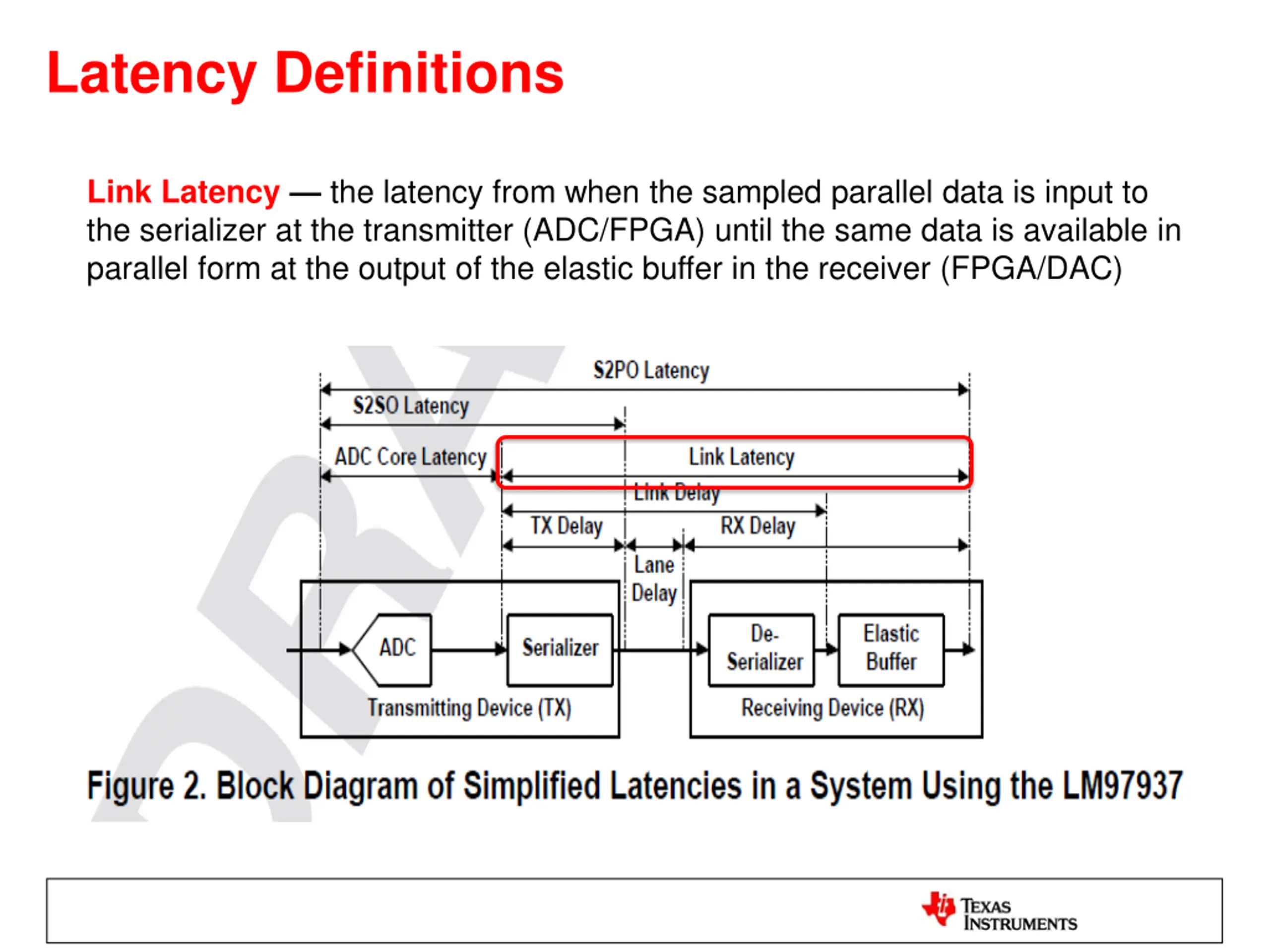 Latency Definitions Link Latency the latency from when the sampled parallel data is input to the serializer at the transmitter (ADC/FPGA) until the same data is available in parallel form at the output of the elastic buffer in the receiver (FPGA/DAC)