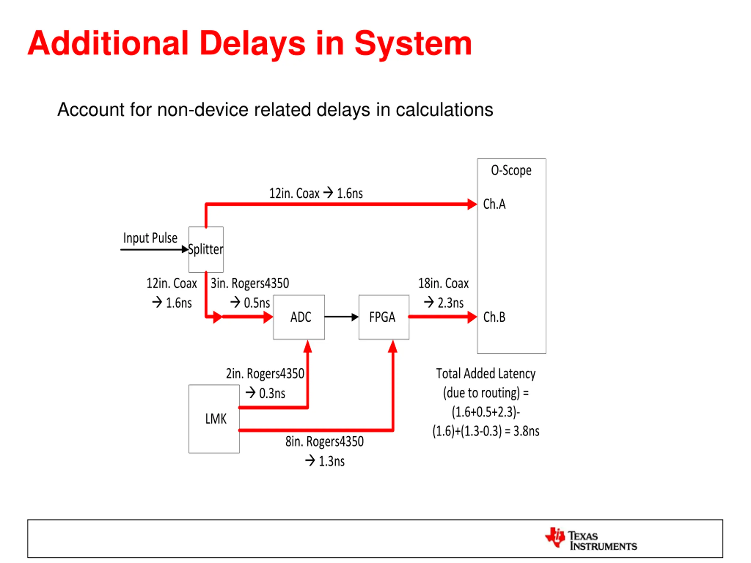 Additional Delays in System Account for non-device related delays in calculations O-Scope 12in. Coax 1.6ns Ch.A Input Pulse Splitter 12in. Coax 1.6ns 3in. Rogers4350 0.5ns 18in. Coax 2.3ns ADC FPGA Ch.B 2in. Rogers4350 0.3ns Total Added Latency (due to routing) = (1.6+0.5+2.3)- (1.6)+(1.3-0.3) = 3.8ns LMK 8in. Rogers4350 1.3ns