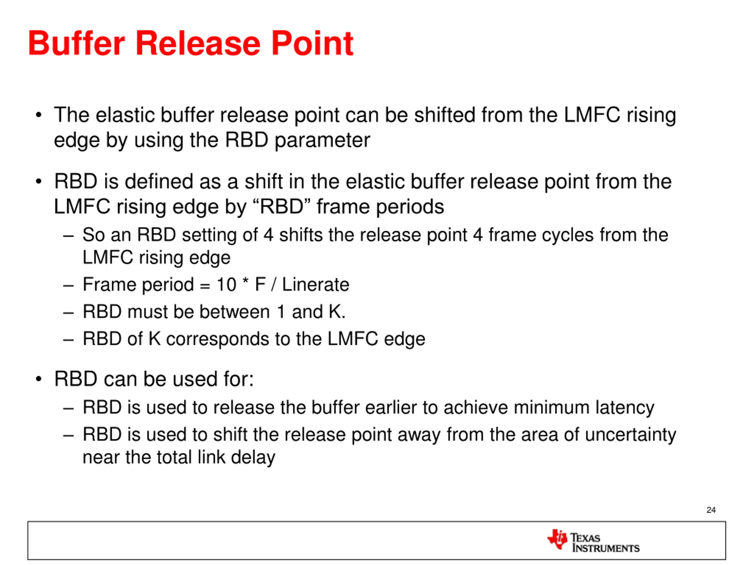 Buffer Release Point The elastic buffer release point can be shifted from the LMFC rising edge by using the RBD parameter RBD is defined as a shift in the elastic buffer release point from the LMFC rising edge by RBD frame periods So an RBD setting of 4 shifts the release point 4 frame cycles from the LMFC rising edge Frame period = 10 * F / Linerate RBD must be between 1 and K. RBD of K corresponds to the LMFC edge RBD can be used for: RBD is used to release the buffer earlier to achieve minimum latency RBD is used to shift the release point away from the area of uncertainty near the total link delay 24