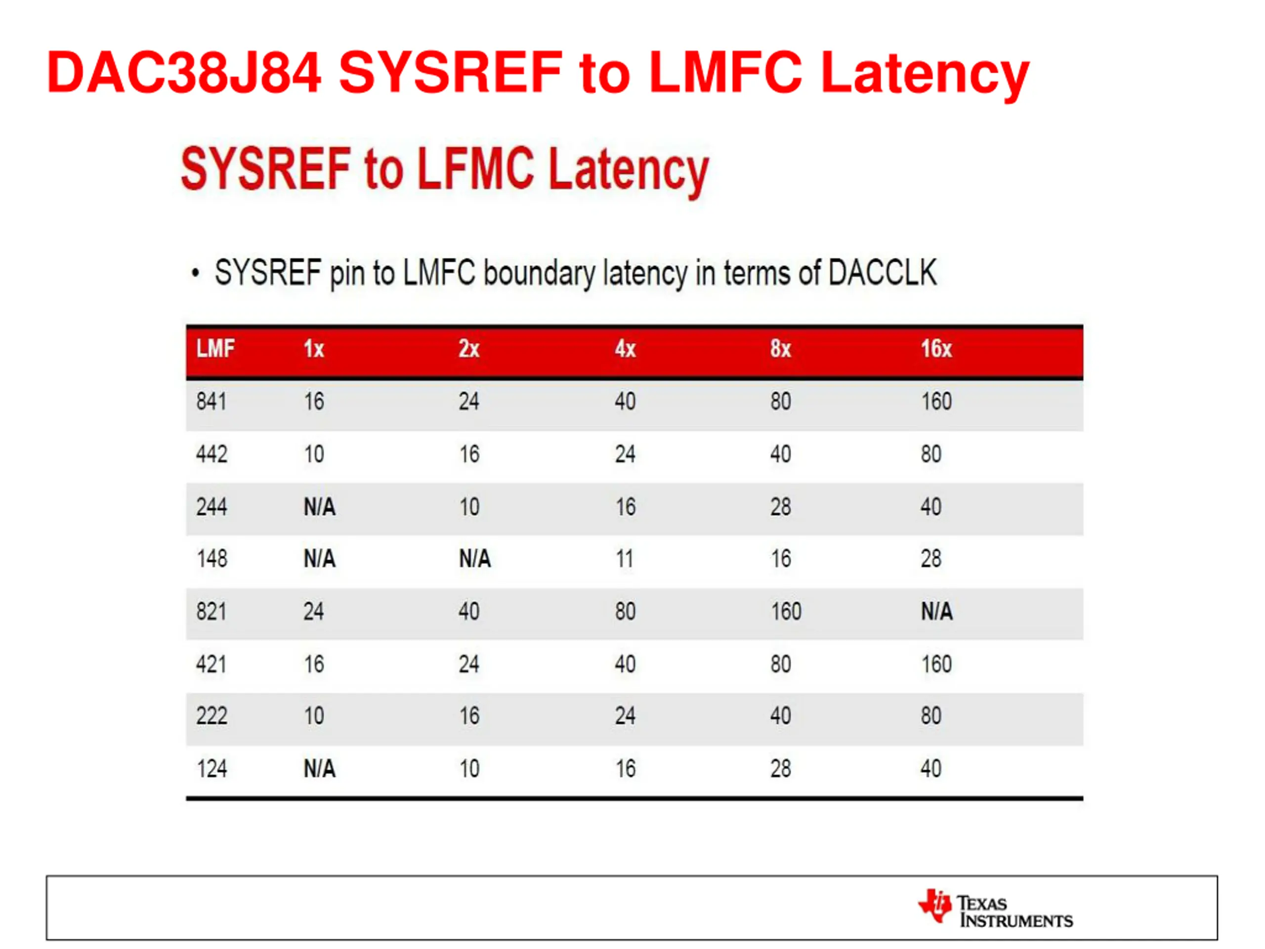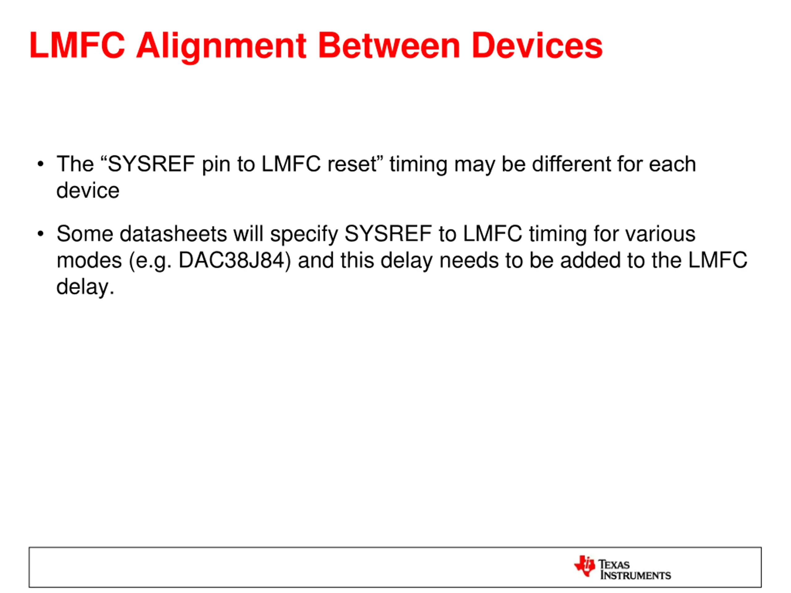 LMFC Alignment Between Devices The SYSREF pin to LMFC reset timing may be different for each device Some datasheets will specify SYSREF to LMFC timing for various modes (e.g. DAC38J84) and this delay needs to be added to the LMFC delay.