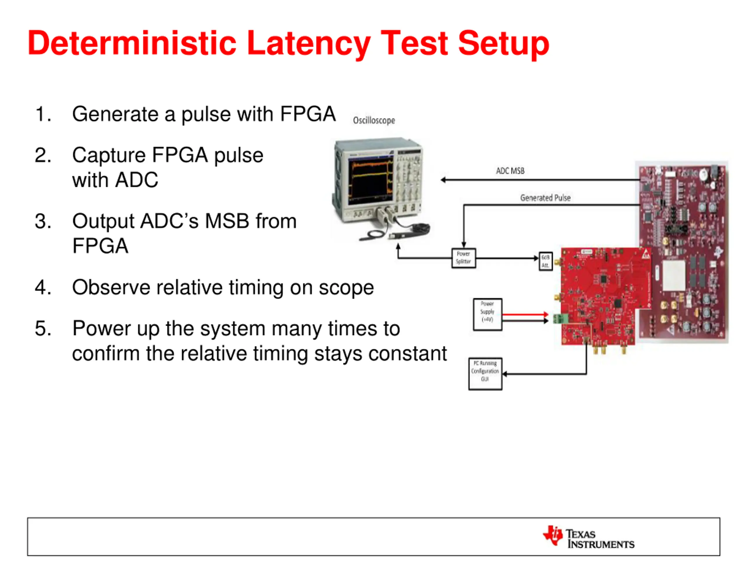 Deterministic Latency Test Setup 1. Generate a pulse with FPGA 2. Capture FPGA pulse with ADC 3. Output ADC s MSB from FPGA 4. Observe relative timing on scope 5. Power up the system many times to confirm the relative timing stays constant