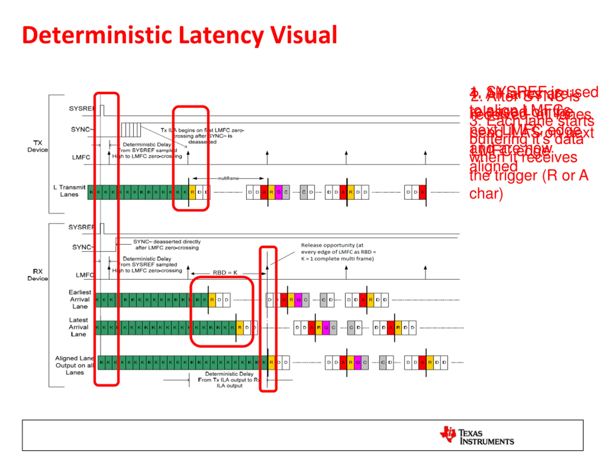Deterministic Latency Visual 1. SYSREF is used to align LMFCs received, all lanes send ILAS on next LMFC edge when it receives the trigger (R or A char) 4. All lanes are released on the next LMFC edge 2. After SYNC is 3. Each lane starts buffering it s data and are now aligned x