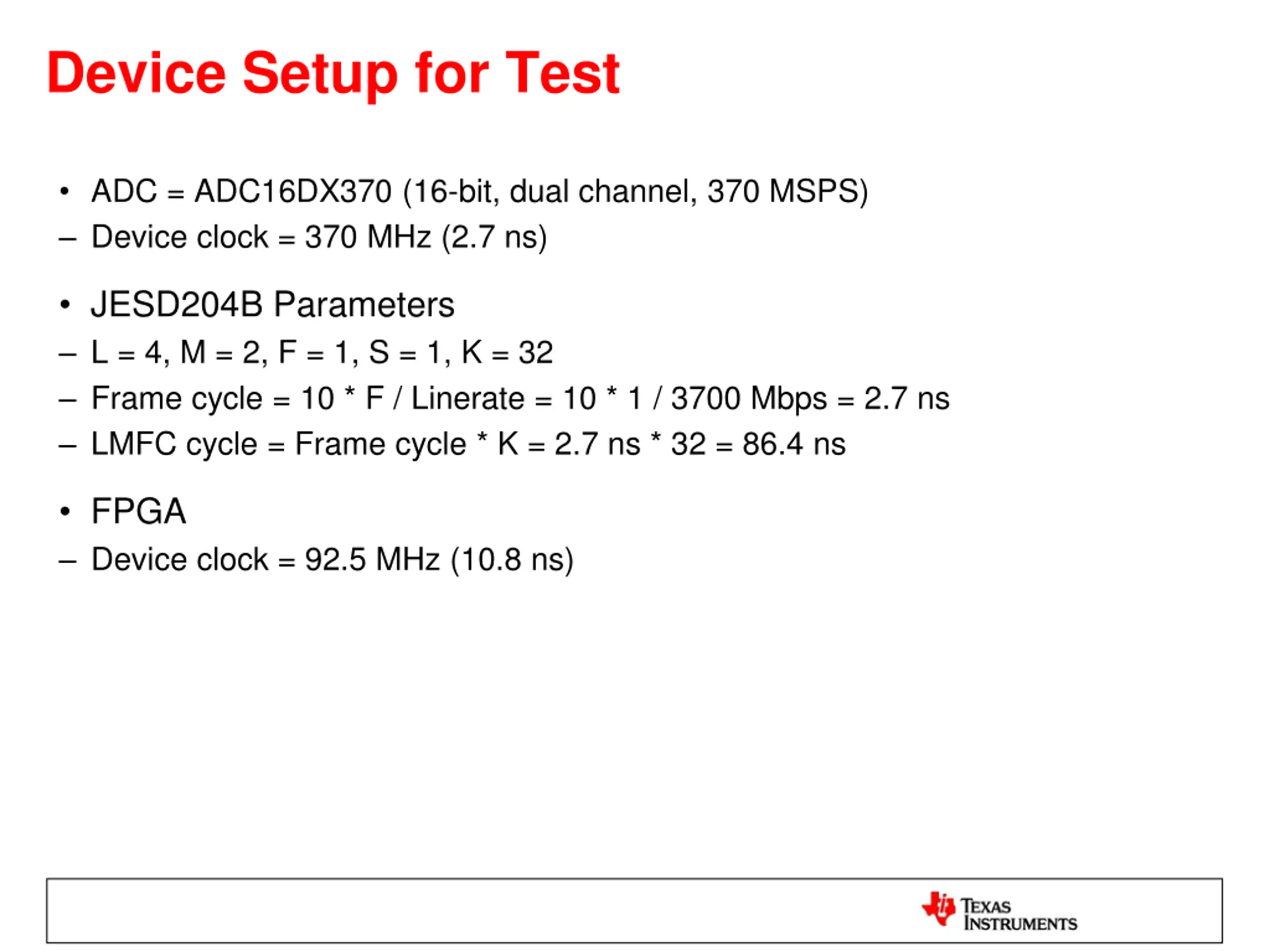 Device Setup for Test ADC = ADC16DX370 (16-bit, dual channel, 370 MSPS) Device clock = 370 MHz (2.7 ns) JESD204B Parameters L = 4, M = 2, F = 1, S = 1, K = 32 Frame cycle = 10 * F / Linerate = 10 * 1 / 3700 Mbps = 2.7 ns LMFC cycle = Frame cycle * K = 2.7 ns * 32 = 86.4 ns FPGA Device clock = 92.5 MHz (10.8 ns)