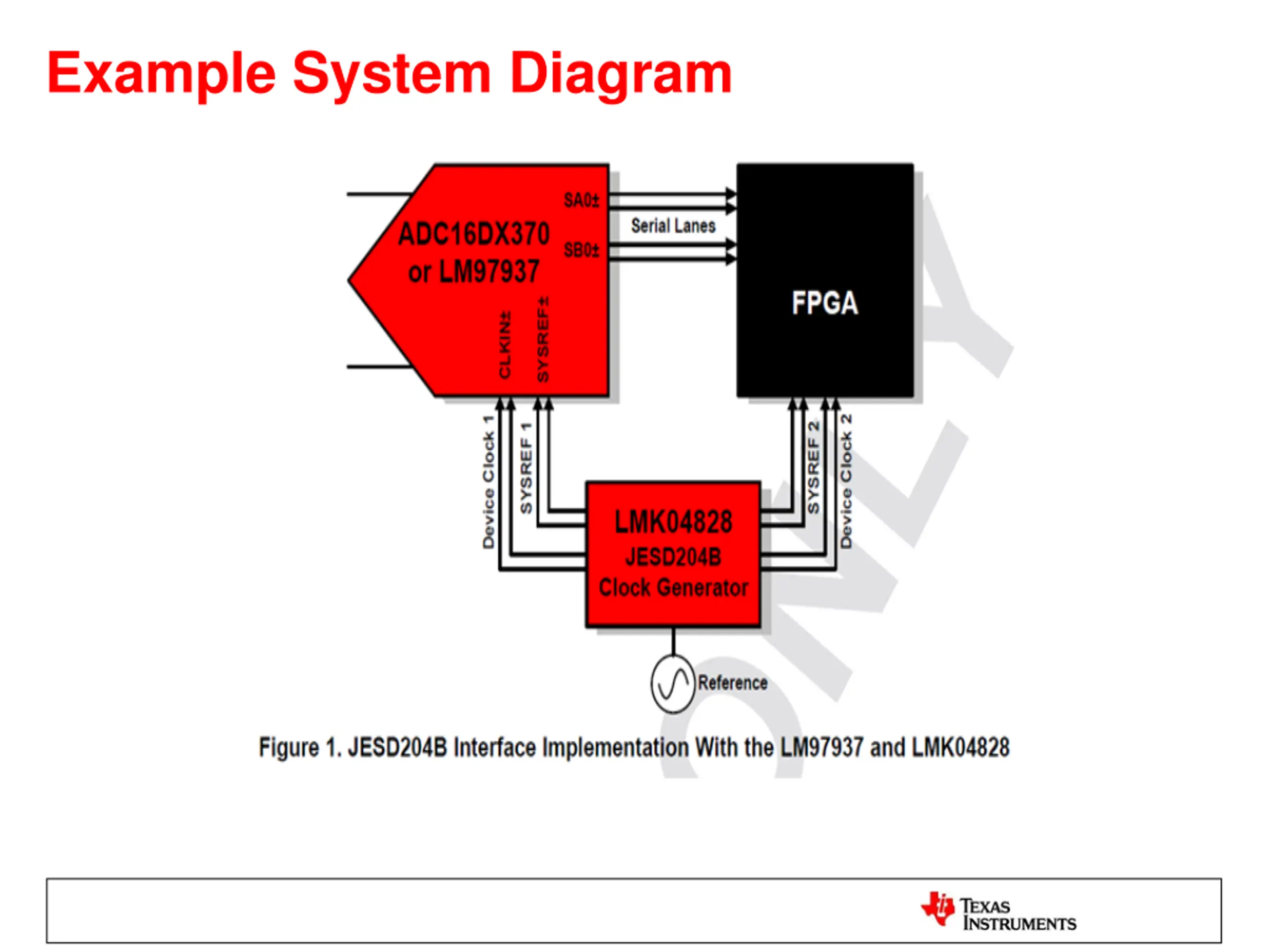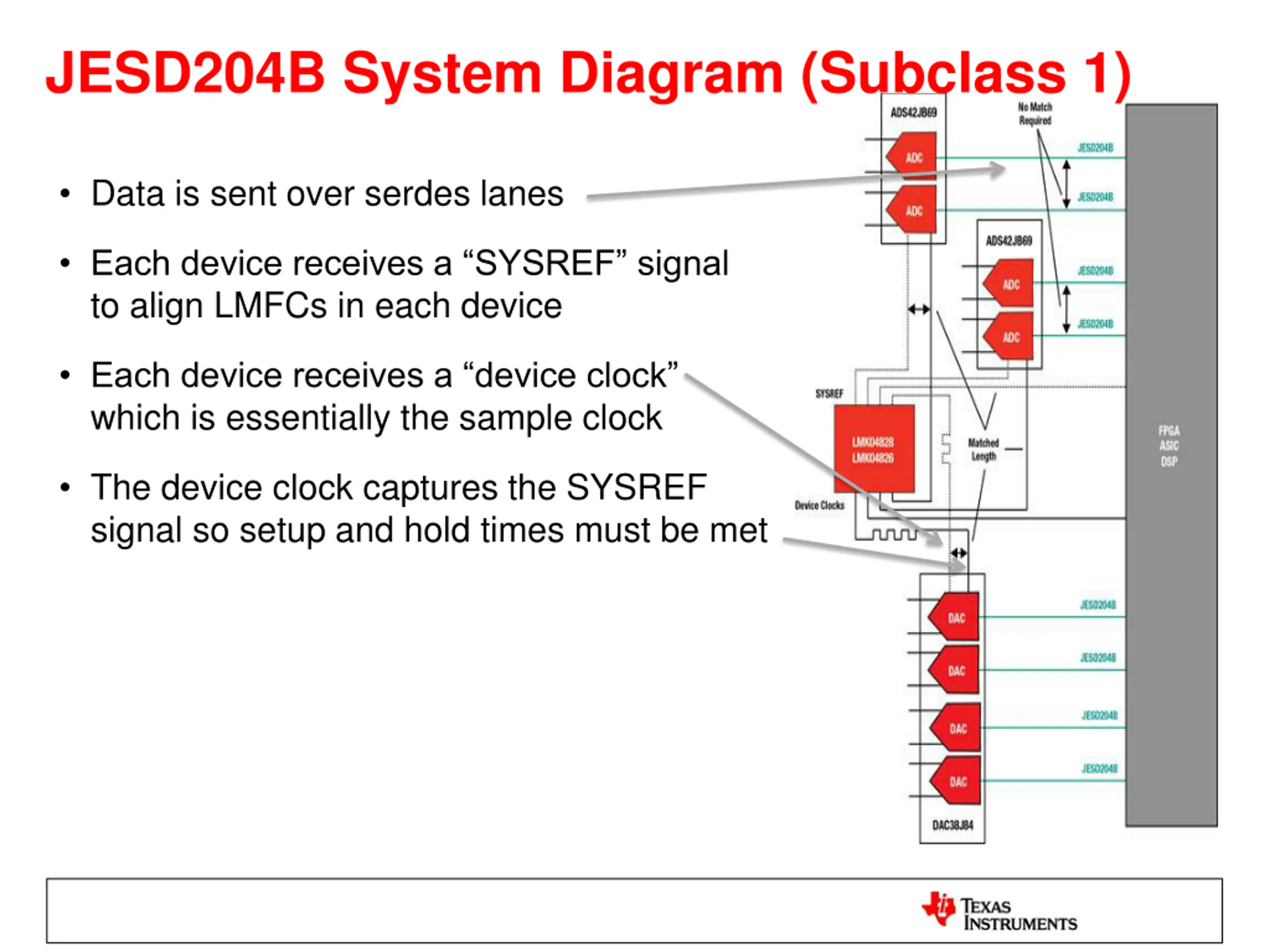 JESD204B System Diagram (Subclass 1) Data is sent over serdes lanes Each device receives a SYSREF signal to align LMFCs in each device Each device receives a device clock which is essentially the sample clock The device clock captures the SYSREF signal so setup and hold times must be met