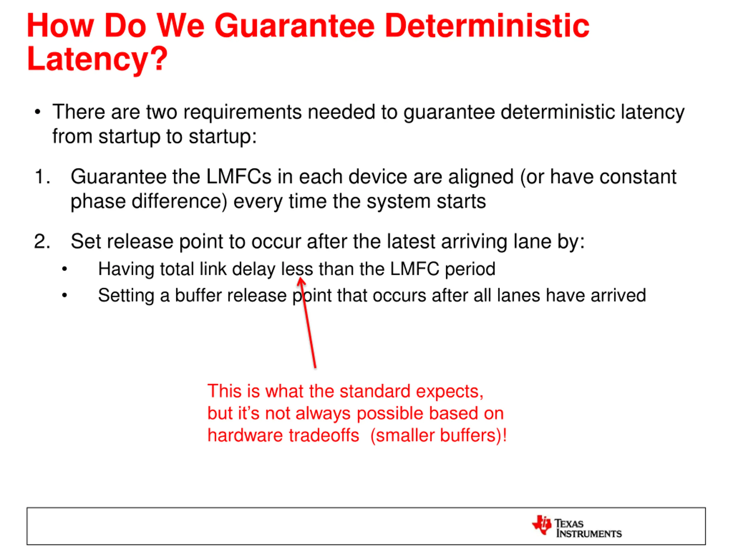 How Do We Guarantee Deterministic Latency? There are two requirements needed to guarantee deterministic latency from startup to startup: 1. Guarantee the LMFCs in each device are aligned (or have constant phase difference) every time the system starts 2. Set release point to occur after the latest arriving lane by: Having total link delay less than the LMFC period Setting a buffer release point that occurs after all lanes have arrived This is what the standard expects, but it s not always possible based on hardware tradeoffs (smaller buffers)!