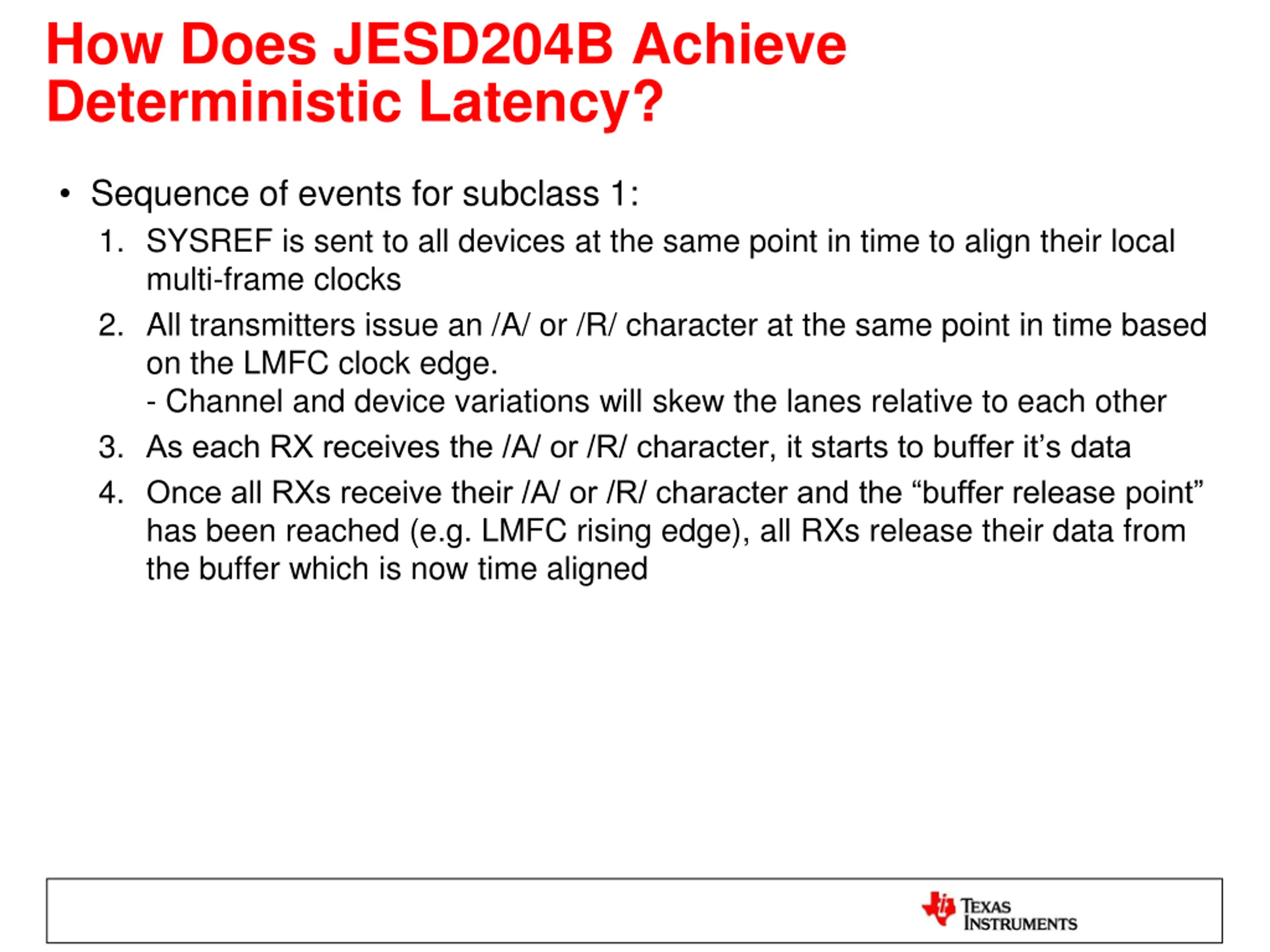 How Does JESD204B Achieve Deterministic Latency? Sequence of events for subclass 1: 1. SYSREF is sent to all devices at the same point in time to align their local multi-frame clocks 2. All transmitters issue an /A/ or /R/ character at the same point in time based on the LMFC clock edge. - Channel and device variations will skew the lanes relative to each other 3. As each RX receives the /A/ or /R/ character, it starts to buffer it s data 4. Once all RXs receive their /A/ or /R/ character and the buffer release point has been reached (e.g. LMFC rising edge), all RXs release their data from the buffer which is now time aligned