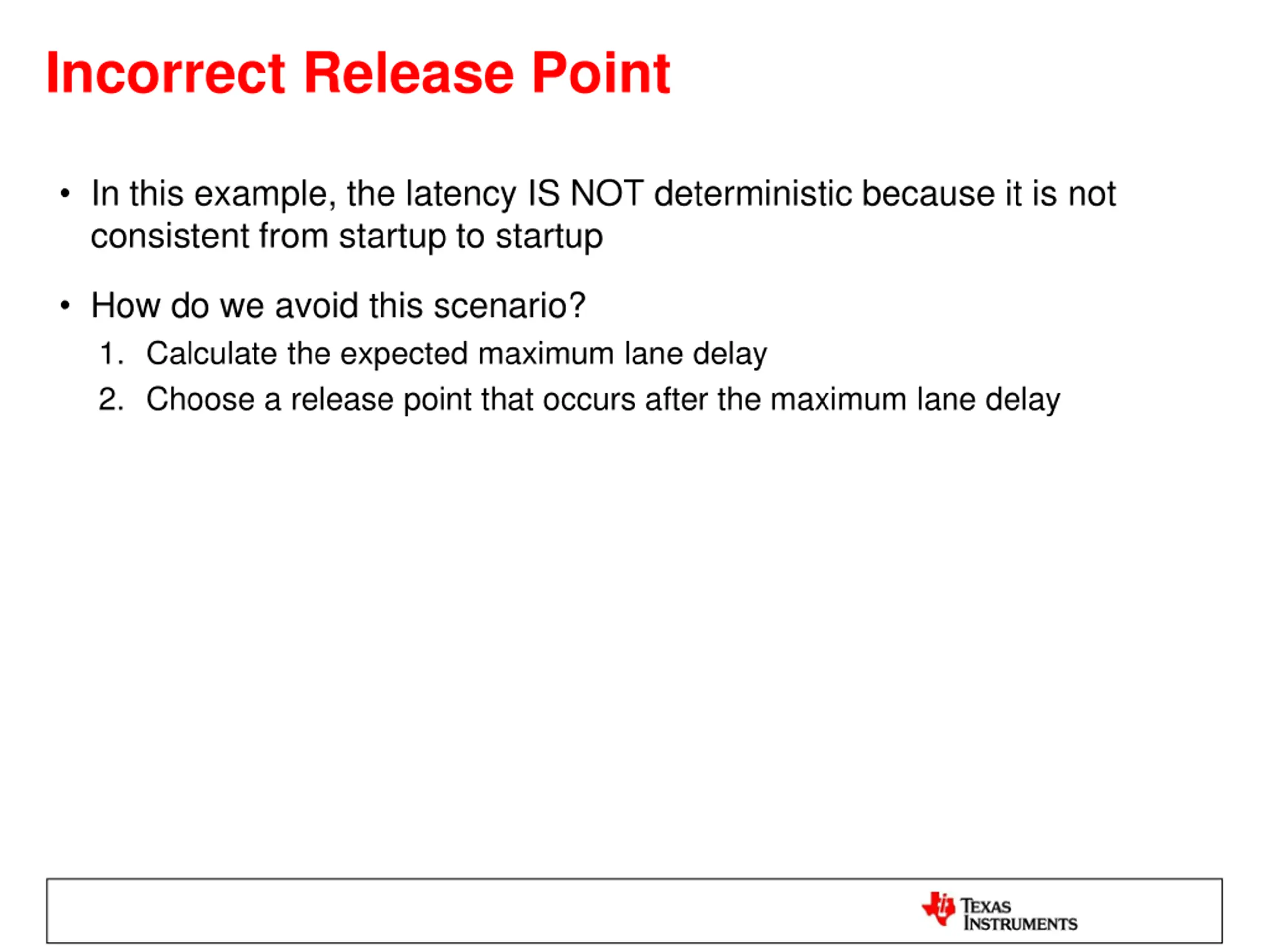 Incorrect Release Point In this example, the latency IS NOT deterministic because it is not consistent from startup to startup How do we avoid this scenario? 1. Calculate the expected maximum lane delay 2. Choose a release point that occurs after the maximum lane delay