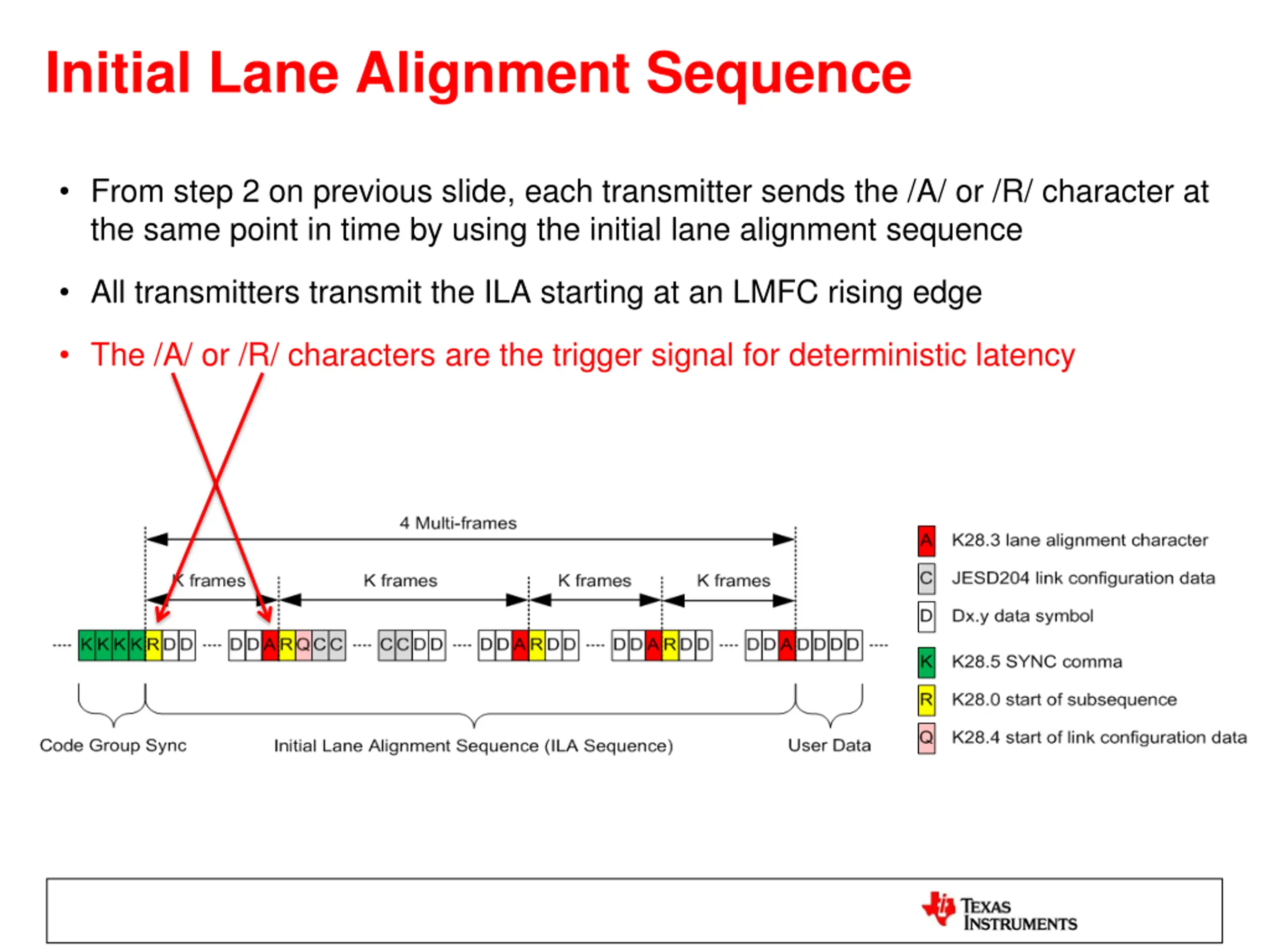 Initial Lane Alignment Sequence From step 2 on previous slide, each transmitter sends the /A/ or /R/ character at the same point in time by using the initial lane alignment sequence All transmitters transmit the ILA starting at an LMFC rising edge The /A/ or /R/ characters are the trigger signal for deterministic latency