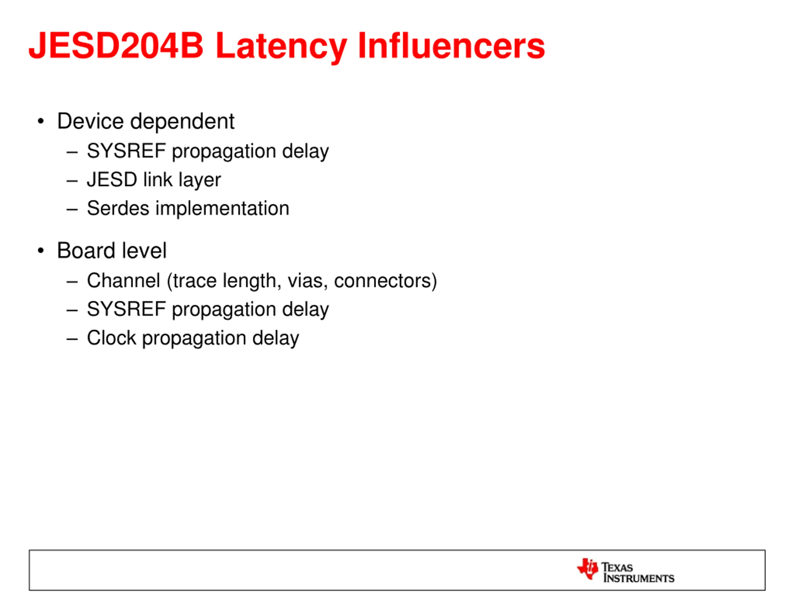 JESD204B Latency Influencers Device dependent SYSREF propagation delay JESD link layer Serdes implementation Board level Channel (trace length, vias, connectors) SYSREF propagation delay Clock propagation delay