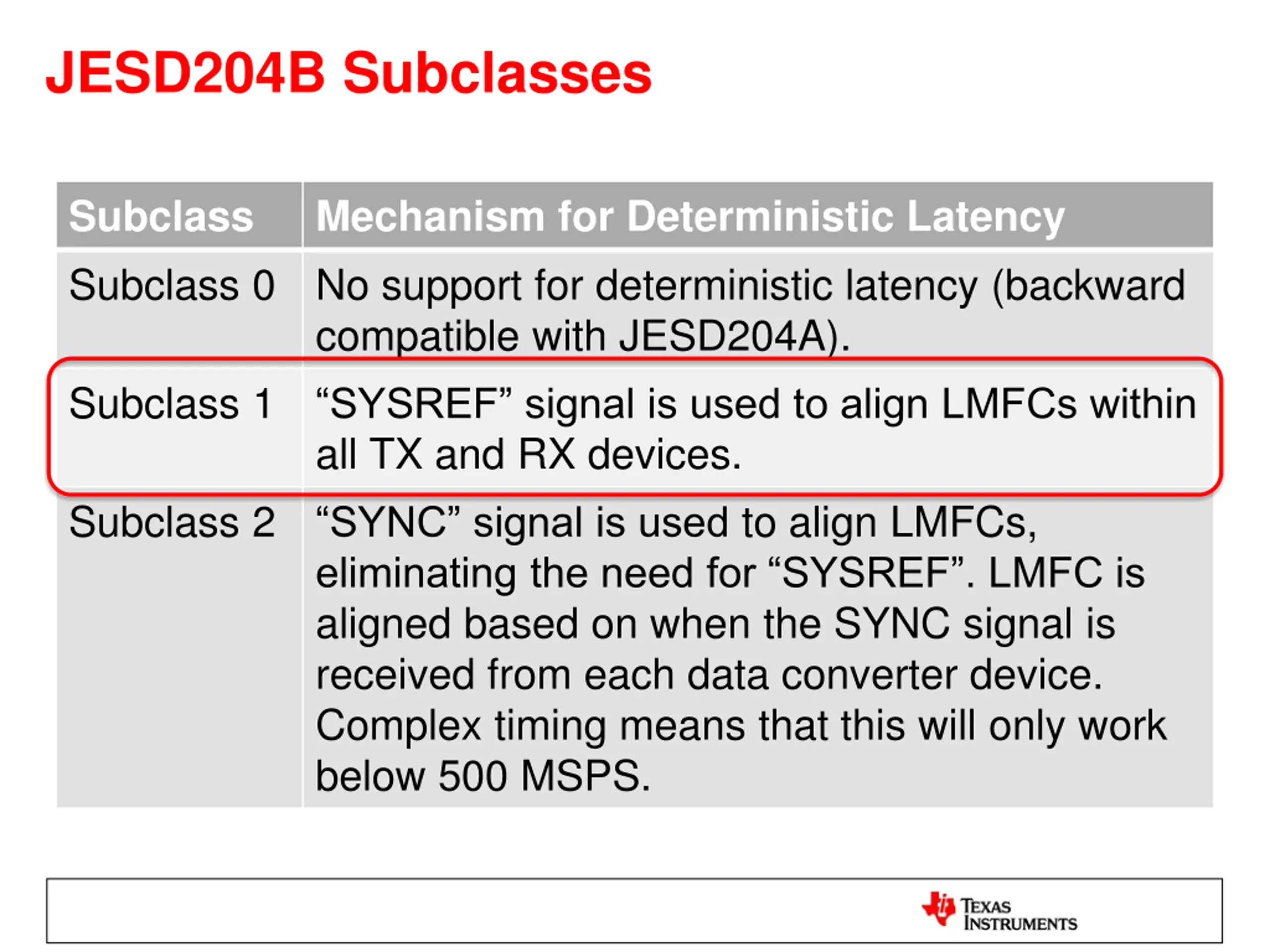 JESD204B Subclasses Subclass Subclass 0 Mechanism for Deterministic Latency No support for deterministic latency (backward compatible with JESD204A). SYSREF signal is used to align LMFCs within all TX and RX devices. SYNC signal is used to align LMFCs, eliminating the need for SYSREF . LMFC is aligned based on when the SYNC signal is received from each data converter device. Complex timing means that this will only work below 500 MSPS. Subclass 1 Subclass 2
