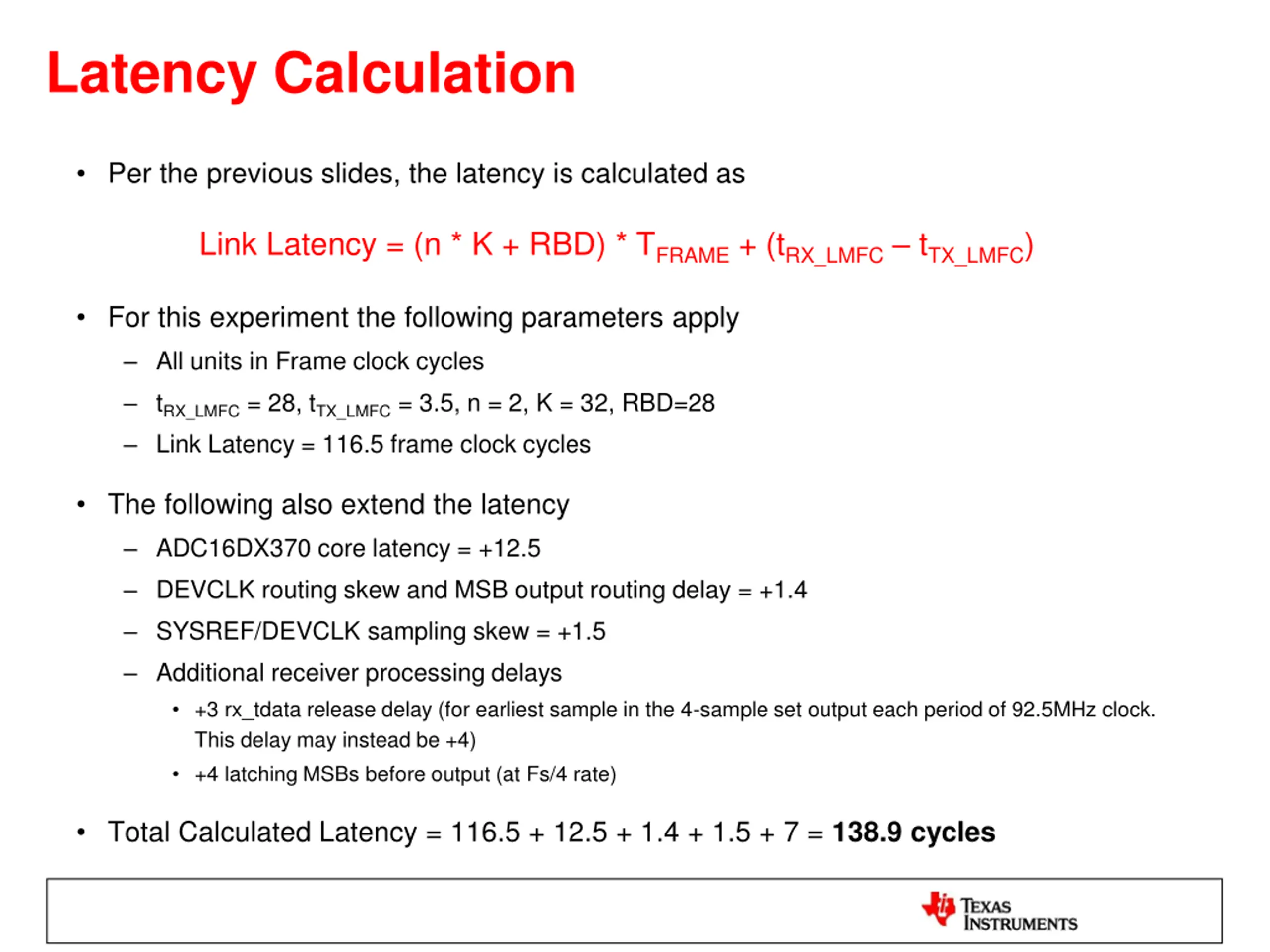 Latency Calculation Per the previous slides, the latency is calculated as Link Latency = (n * K + RBD) * TFRAME + (tRX_LMFC tTX_LMFC) For this experiment the following parameters apply All units in Frame clock cycles tRX_LMFC = 28, tTX_LMFC = 3.5, n = 2, K = 32, RBD=28 Link Latency = 116.5 frame clock cycles The following also extend the latency ADC16DX370 core latency = +12.5 DEVCLK routing skew and MSB output routing delay = +1.4 SYSREF/DEVCLK sampling skew = +1.5 Additional receiver processing delays +3 rx_tdata release delay (for earliest sample in the 4-sample set output each period of 92.5MHz clock. This delay may instead be +4) +4 latching MSBs before output (at Fs/4 rate) Total Calculated Latency = 116.5 + 12.5 + 1.4 + 1.5 + 7 = 138.9 cycles