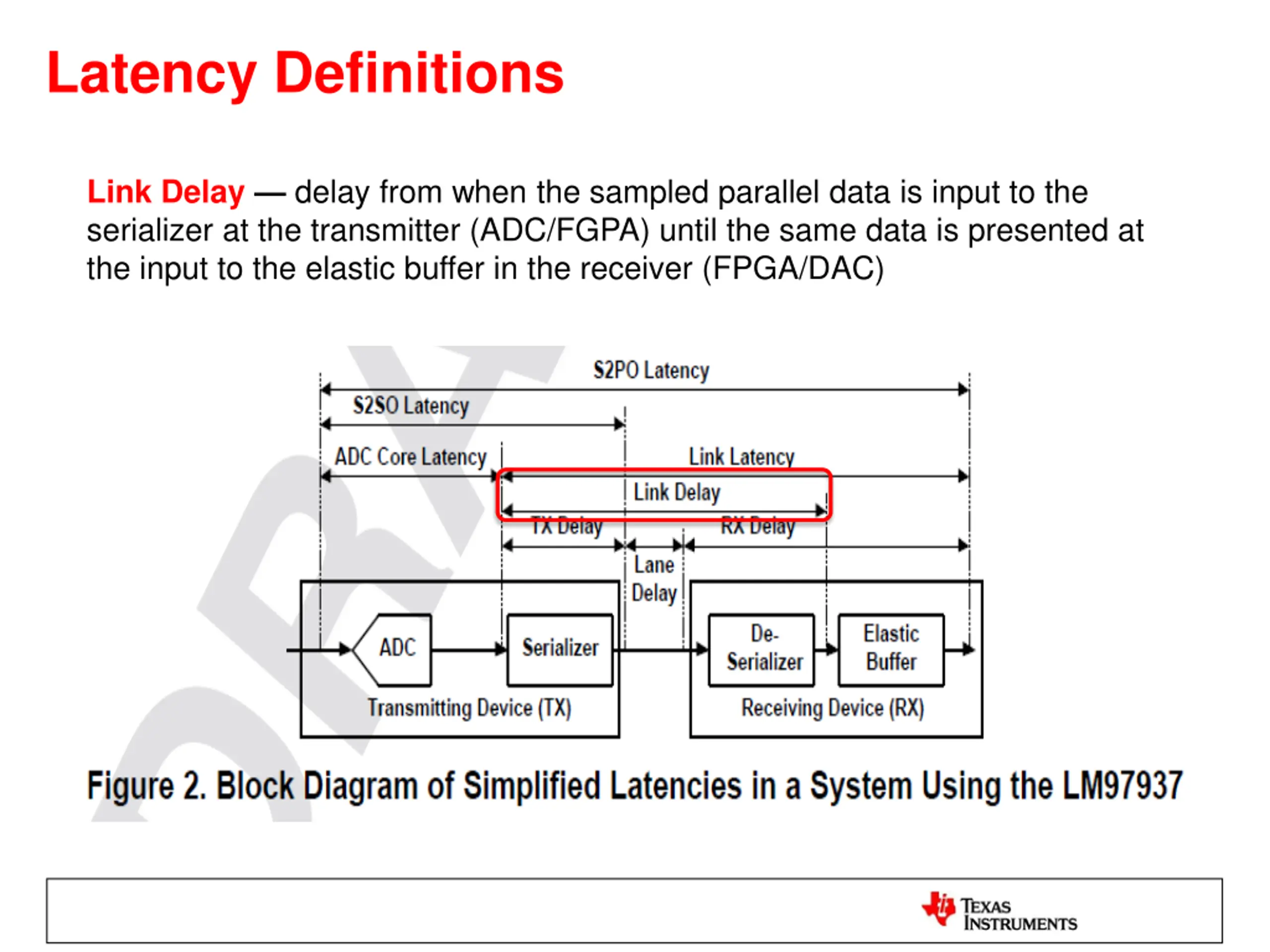 Latency Definitions Link Delay delay from when the sampled parallel data is input to the serializer at the transmitter (ADC/FGPA) until the same data is presented at the input to the elastic buffer in the receiver (FPGA/DAC)