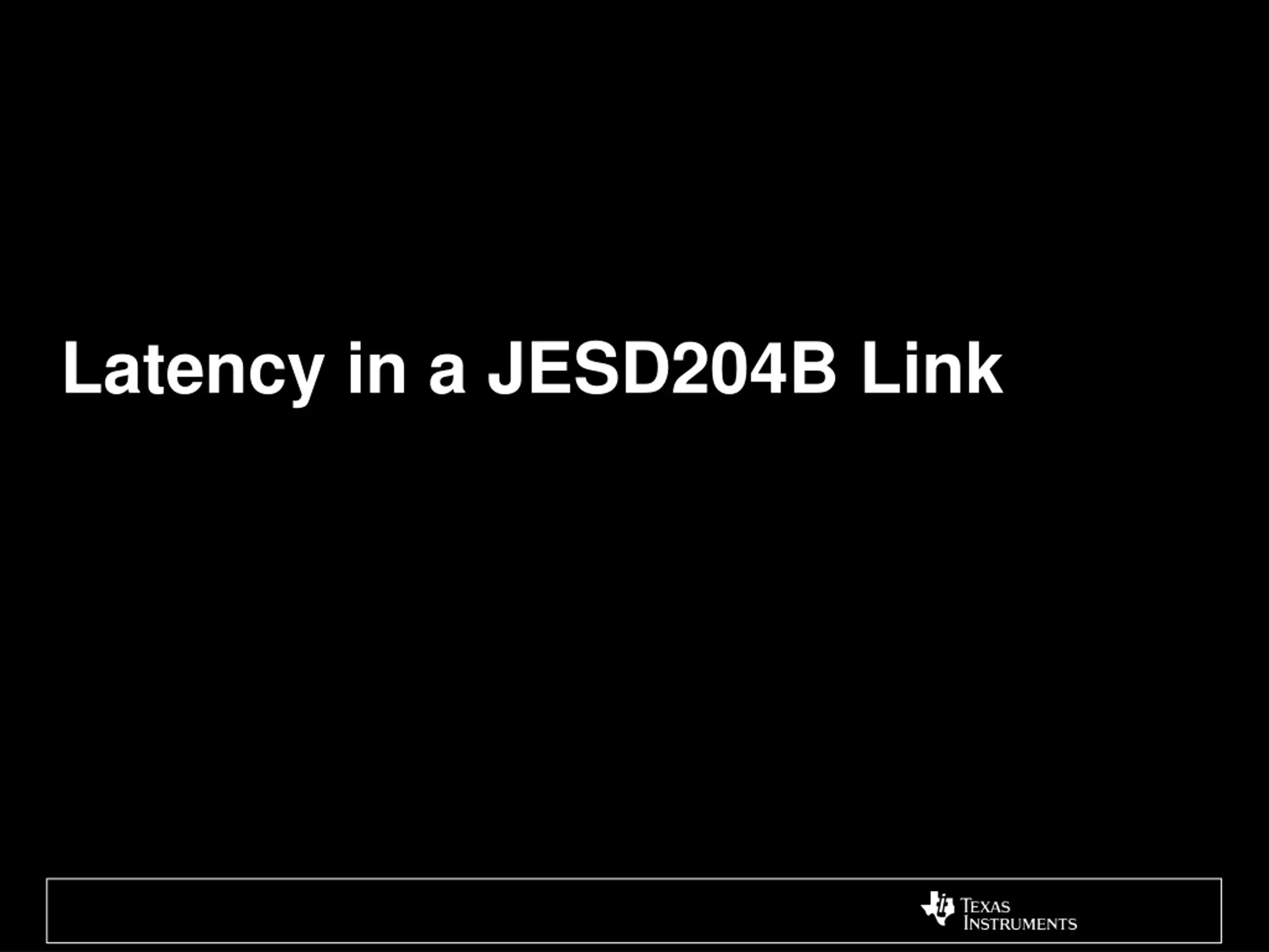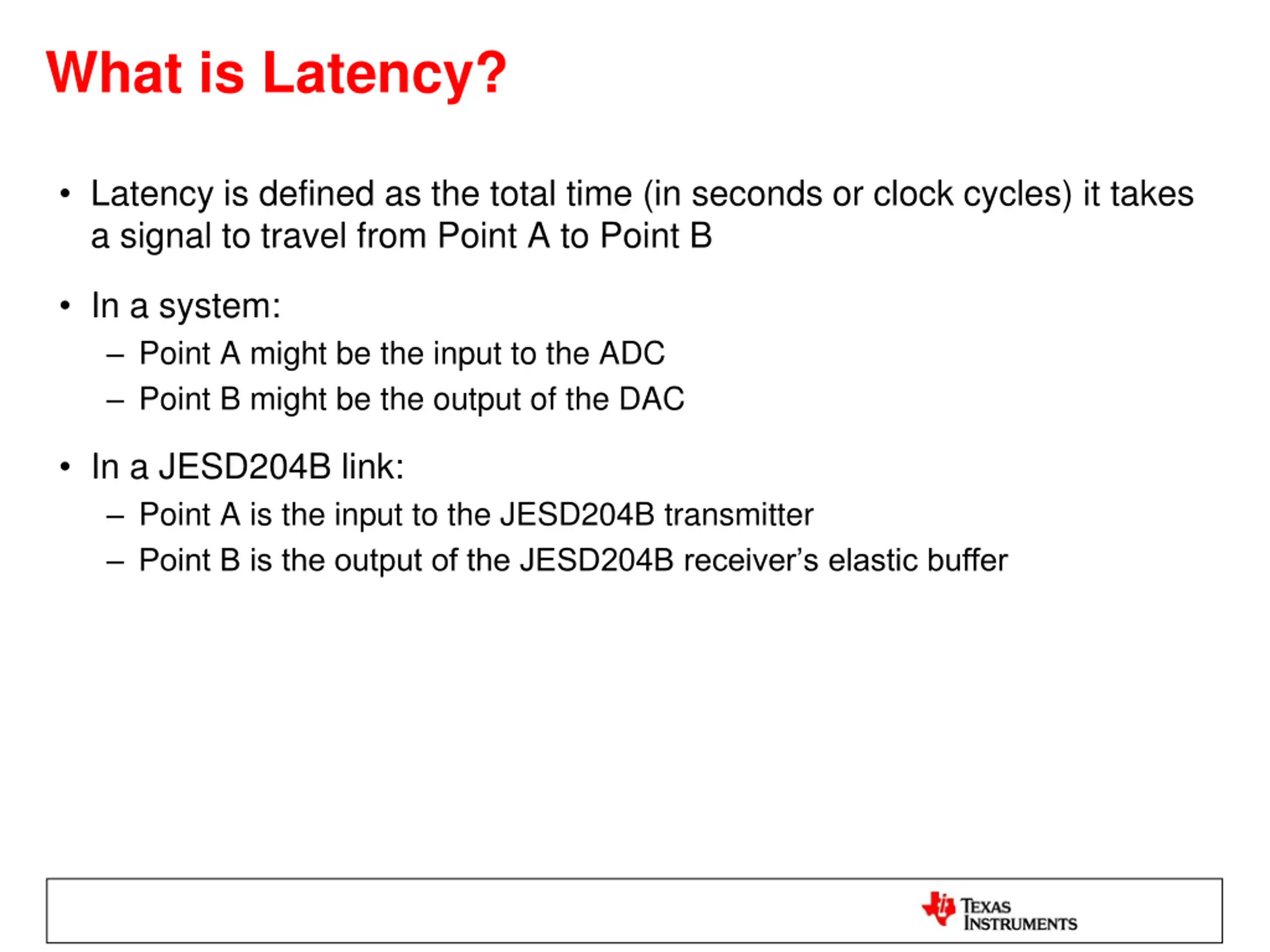 What is Latency? Latency is defined as the total time (in seconds or clock cycles) it takes a signal to travel from Point A to Point B In a system: Point A might be the input to the ADC Point B might be the output of the DAC In a JESD204B link: Point A is the input to the JESD204B transmitter Point B is the output of the JESD204B receiver s elastic buffer