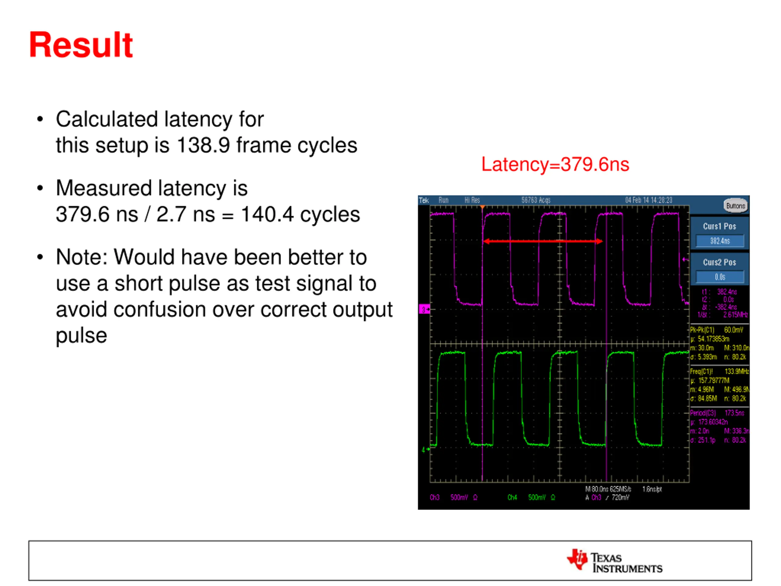 Result Calculated latency for this setup is 138.9 frame cycles Latency=379.6ns Measured latency is 379.6 ns / 2.7 ns = 140.4 cycles Note: Would have been better to use a short pulse as test signal to avoid confusion over correct output pulse