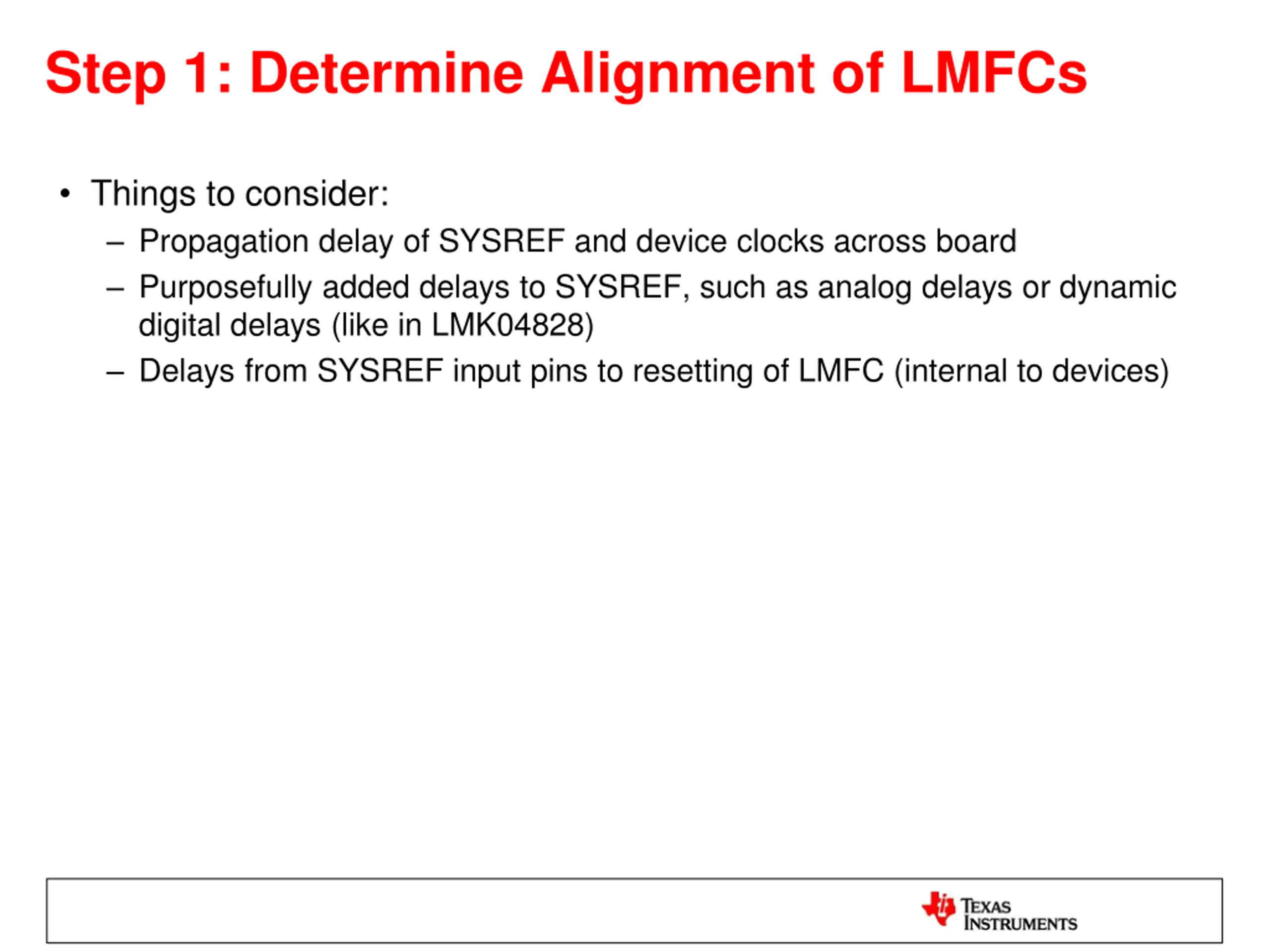 Step 1: Determine Alignment of LMFCs Things to consider: Propagation delay of SYSREF and device clocks across board Purposefully added delays to SYSREF, such as analog delays or dynamic digital delays (like in LMK04828) Delays from SYSREF input pins to resetting of LMFC (internal to devices)