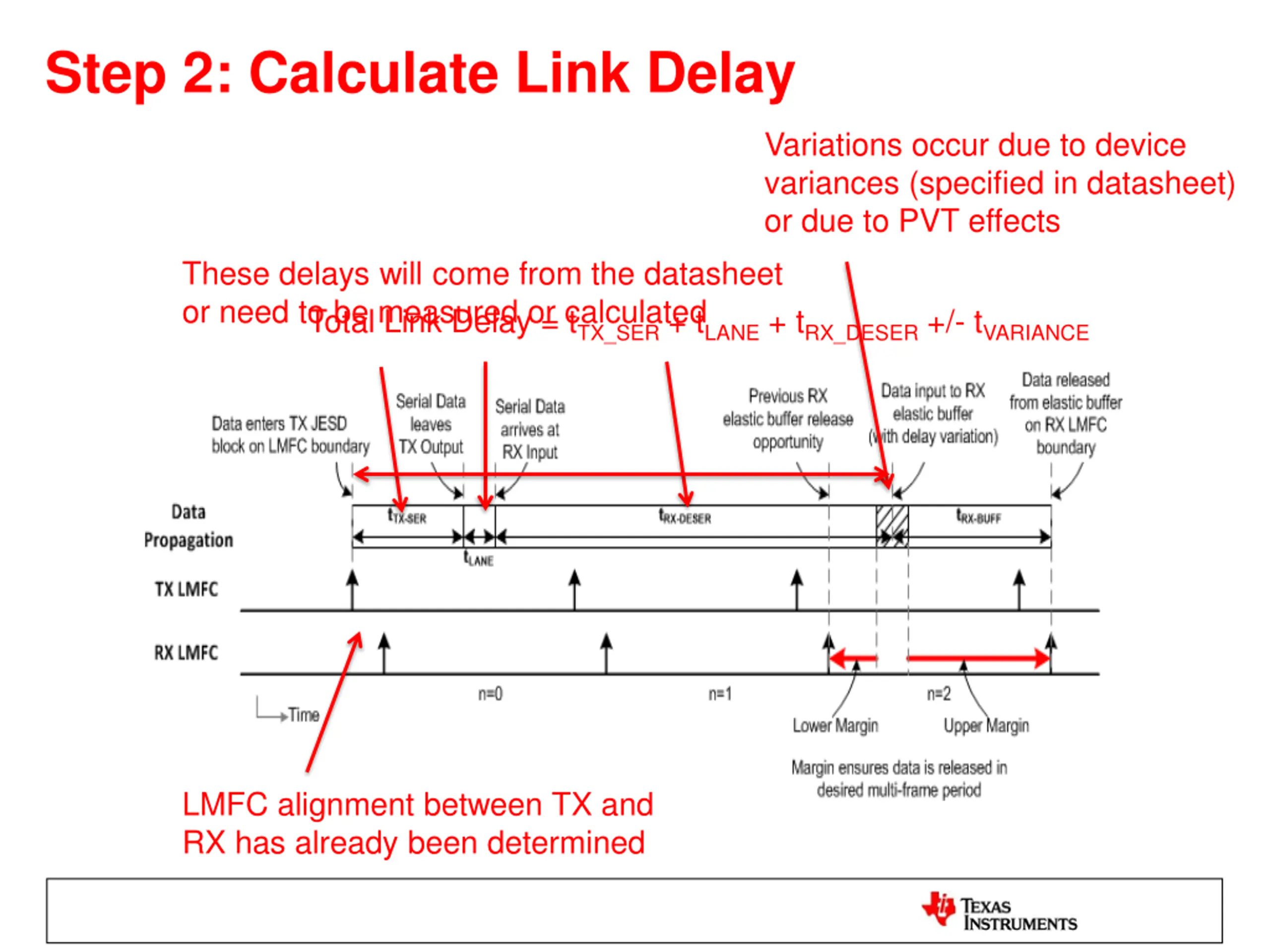 Step 2: Calculate Link Delay Variations occur due to device variances (specified in datasheet) or due to PVT effects These delays will come from the datasheet or need to be measured or calculated Total Link Delay = tTX_SER + tLANE + tRX_DESER +/- tVARIANCE LMFC alignment between TX and RX has already been determined