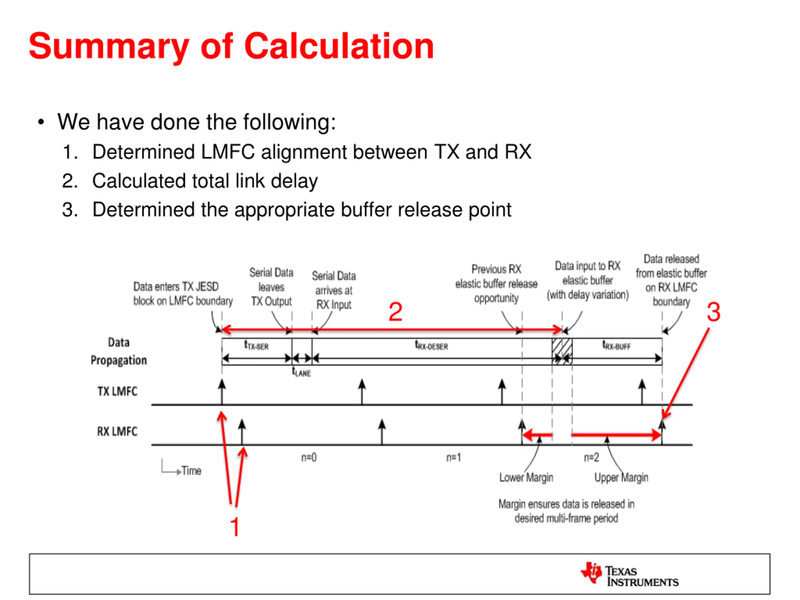 Summary of Calculation We have done the following: 1. Determined LMFC alignment between TX and RX 2. Calculated total link delay 3. Determined the appropriate buffer release point 2 3 1