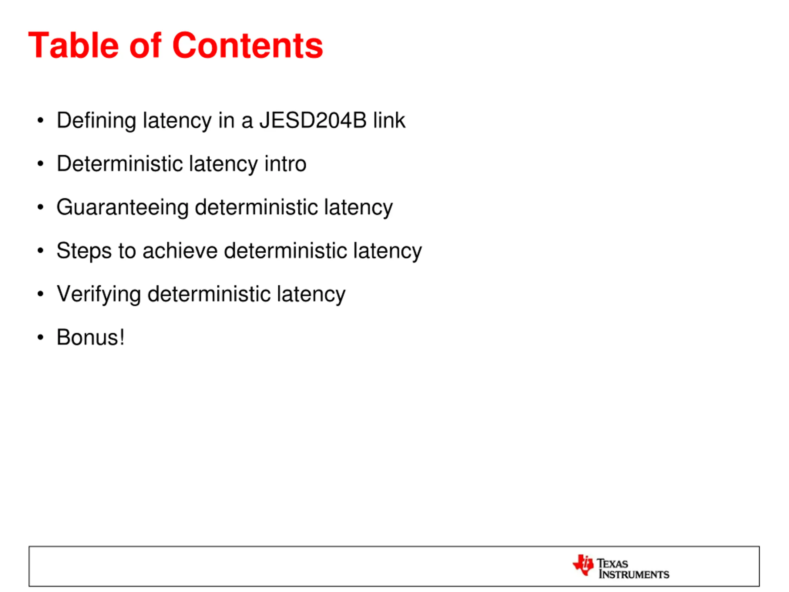 Table of Contents Defining latency in a JESD204B link Deterministic latency intro Guaranteeing deterministic latency Steps to achieve deterministic latency Verifying deterministic latency Bonus!