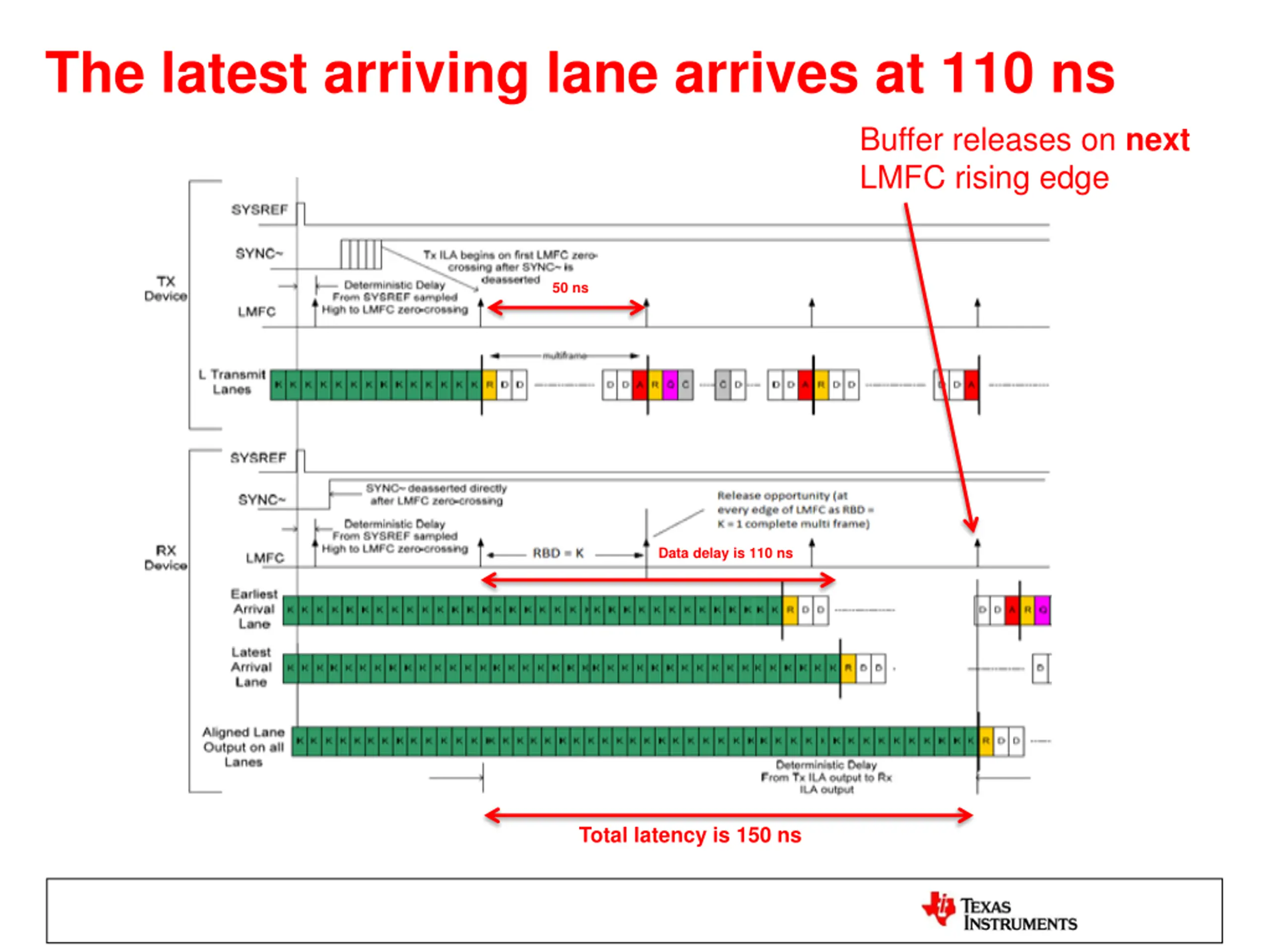 The latest arriving lane arrives at 110 ns Buffer releases on next LMFC rising edge 50 ns Data delay is 110 ns Total latency is 150 ns