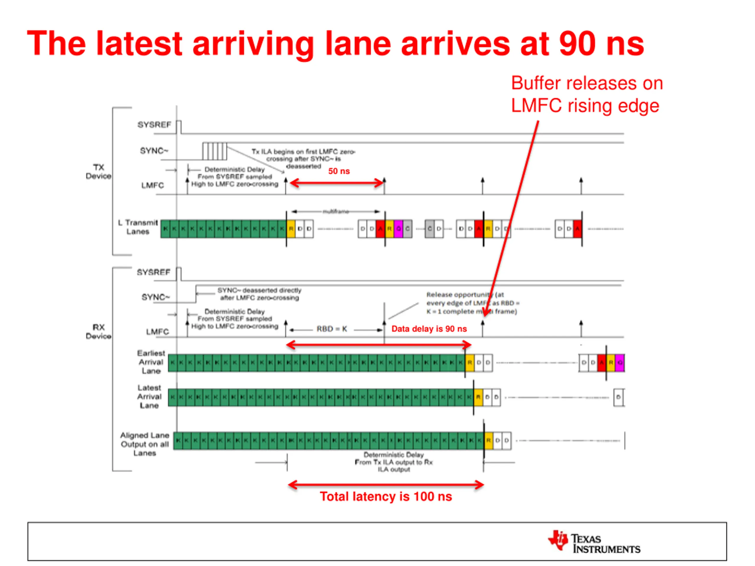 The latest arriving lane arrives at 90 ns Buffer releases on LMFC rising edge 50 ns Data delay is 90 ns Total latency is 100 ns