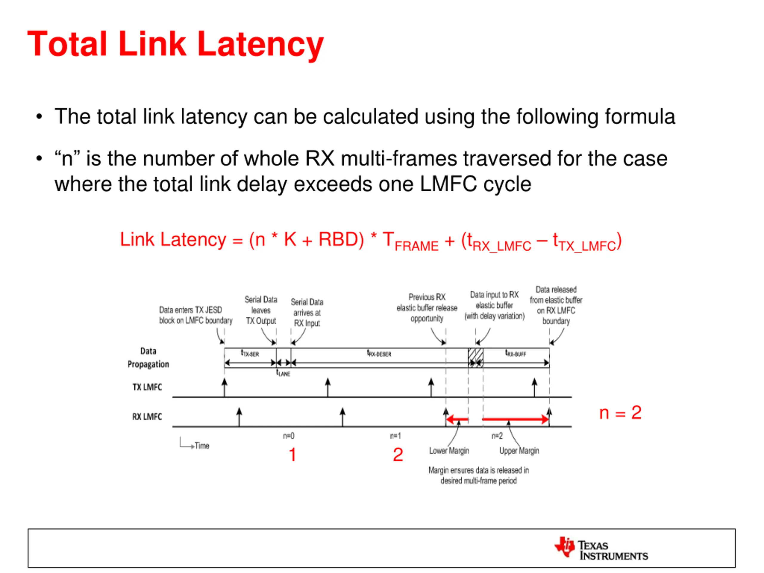 Total Link Latency The total link latency can be calculated using the following formula n is the number of whole RX multi-frames traversed for the case where the total link delay exceeds one LMFC cycle Link Latency = (n * K + RBD) * TFRAME + (tRX_LMFC tTX_LMFC) n = 2 1 2