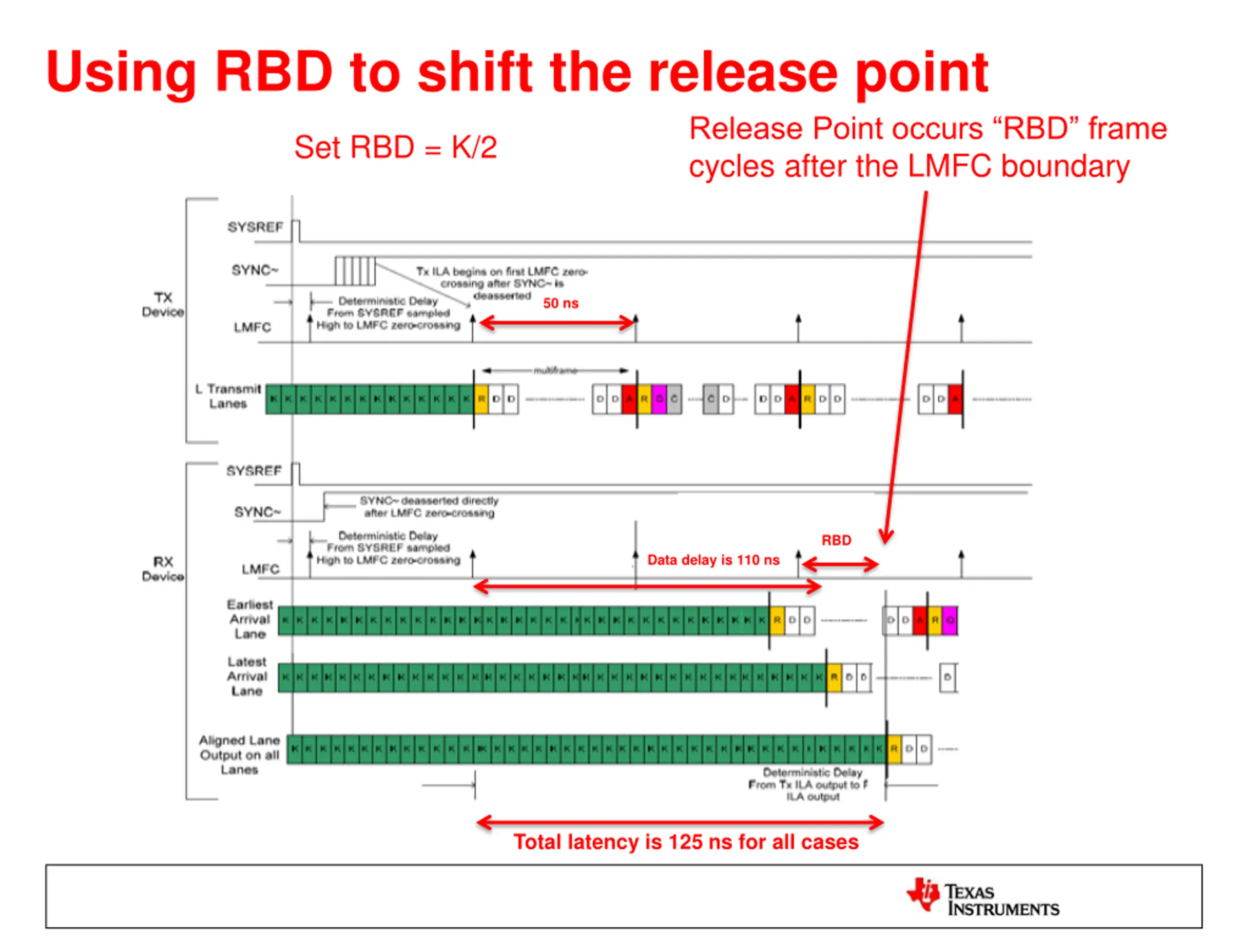Using RBD to shift the release point Release Point occurs RBD frame cycles after the LMFC boundary Set RBD = K/2 50 ns RBD Data delay is 110 ns Total latency is 125 ns for all cases