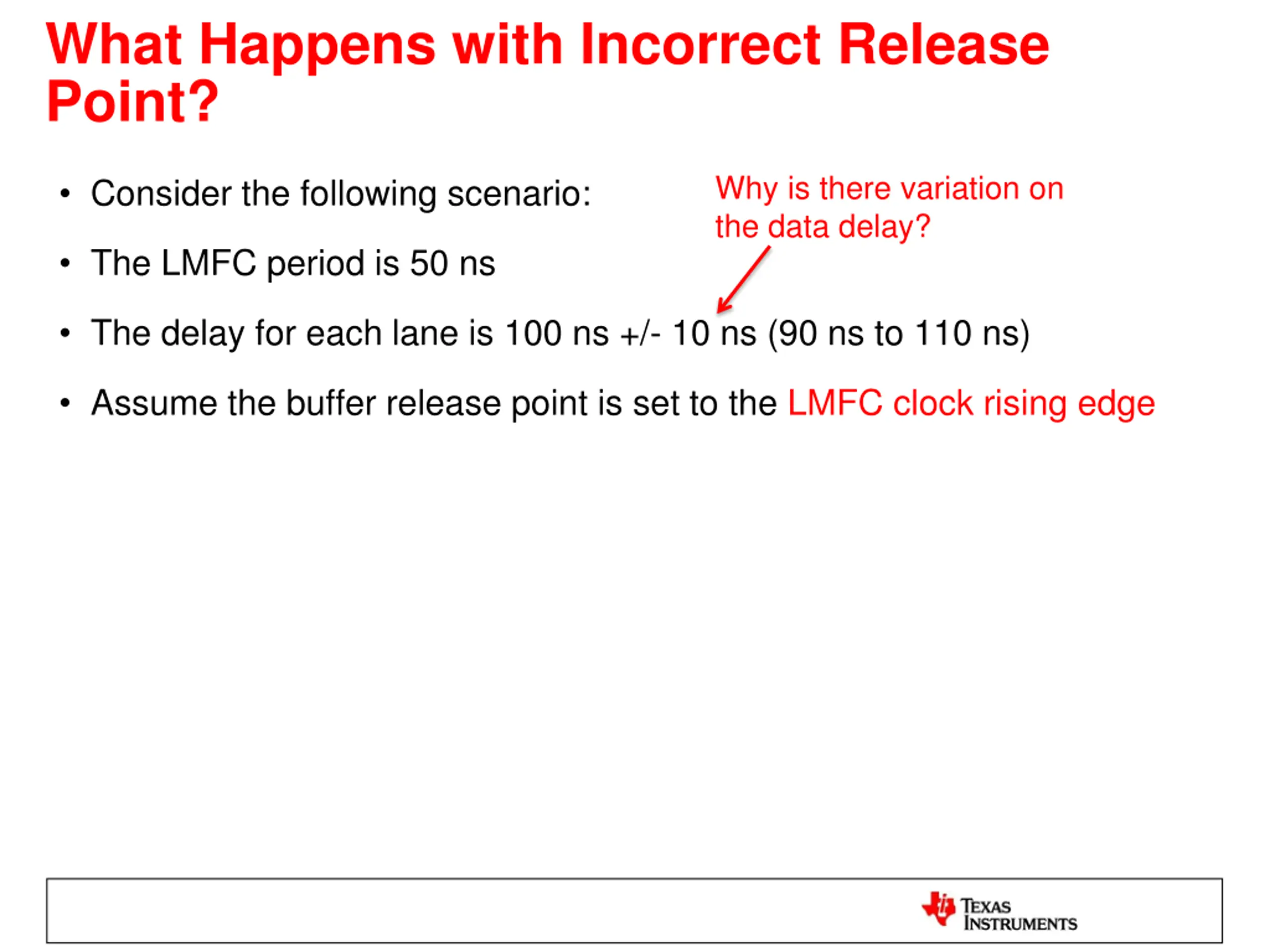 What Happens with Incorrect Release Point? Why is there variation on the data delay? Consider the following scenario: The LMFC period is 50 ns The delay for each lane is 100 ns +/- 10 ns (90 ns to 110 ns) Assume the buffer release point is set to the LMFC clock rising edge