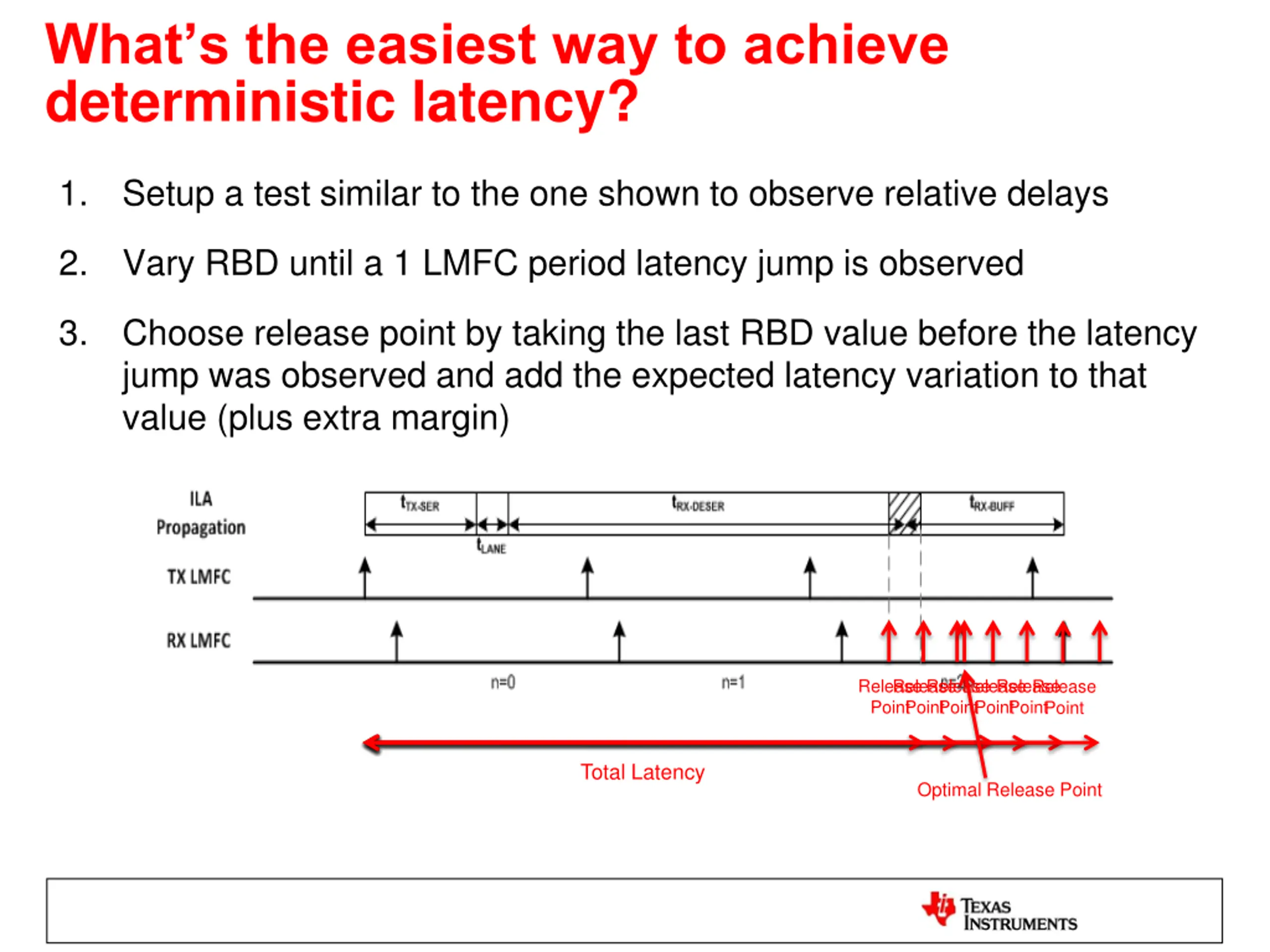 Whats the easiest way to achieve deterministic latency? 1. Setup a test similar to the one shown to observe relative delays 2. Vary RBD until a 1 LMFC period latency jump is observed 3. Choose release point by taking the last RBD value before the latency jump was observed and add the expected latency variation to that value (plus extra margin) Release Release Release Release Release Release Point Point Point Point Point Point Total Latency Optimal Release Point