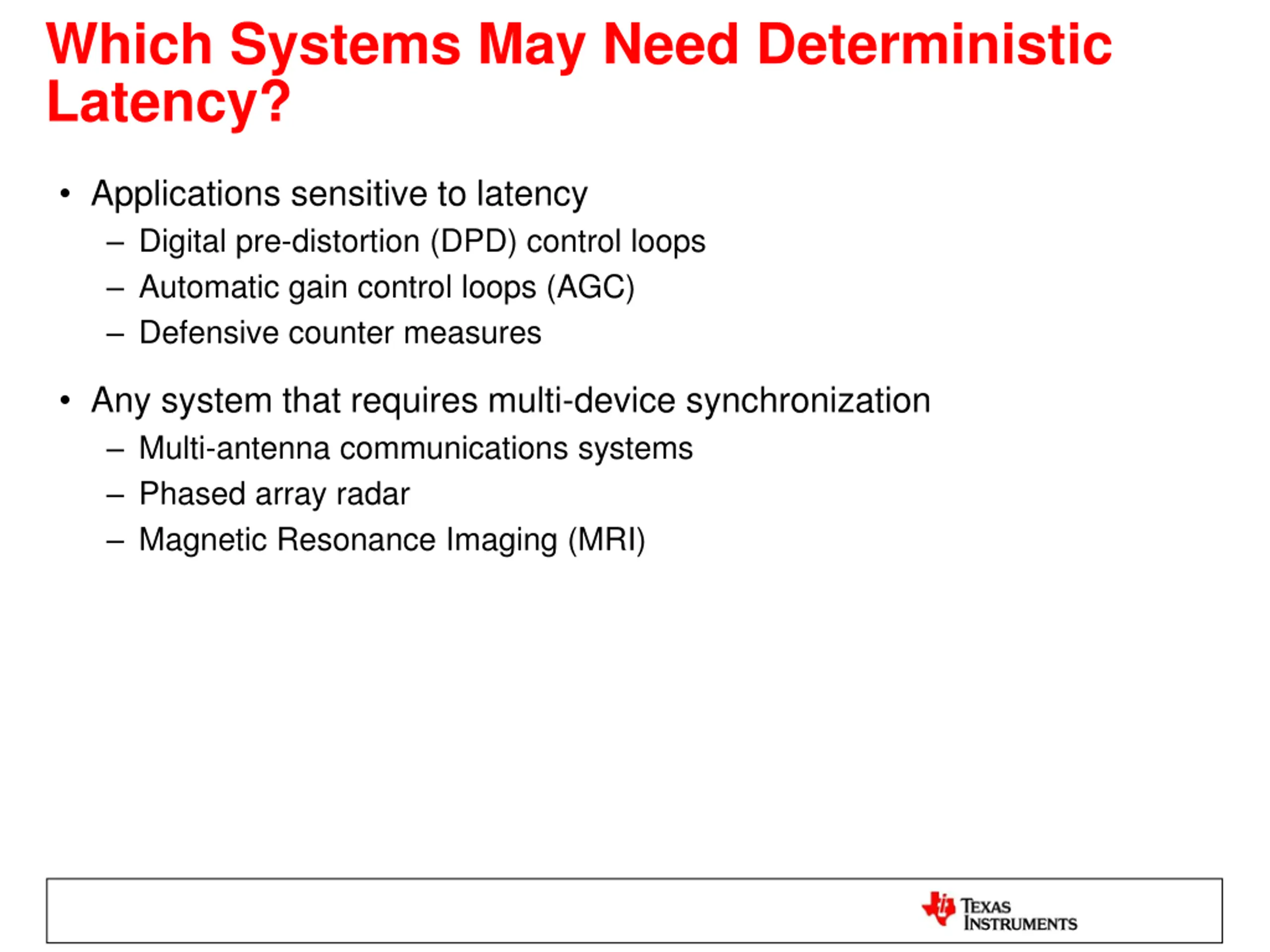 Which Systems May Need Deterministic Latency? Applications sensitive to latency Digital pre-distortion (DPD) control loops Automatic gain control loops (AGC) Defensive counter measures Any system that requires multi-device synchronization Multi-antenna communications systems Phased array radar Magnetic Resonance Imaging (MRI)
