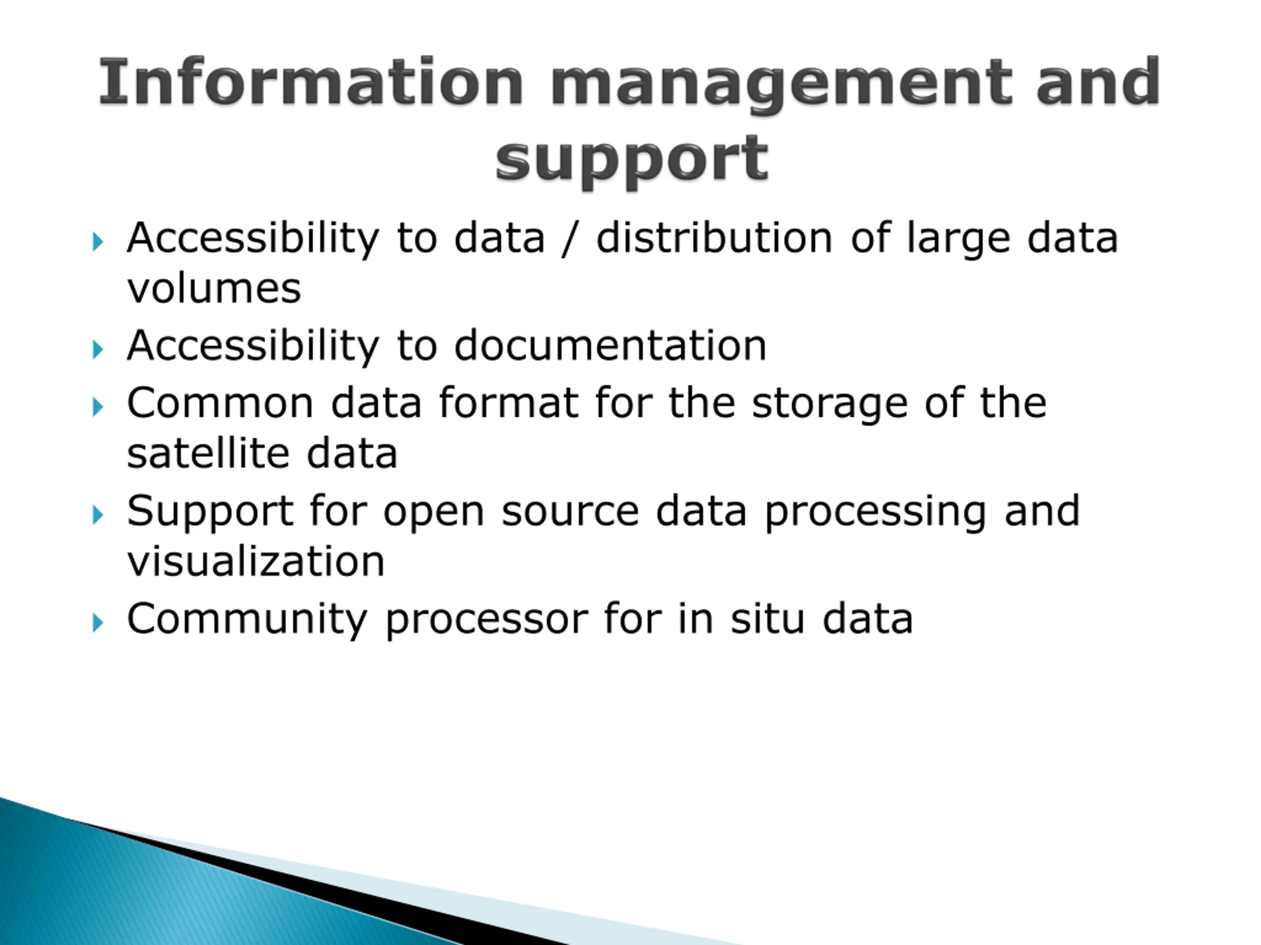 Accessibility to data / distribution of large data volumes Accessibility to documentation Common data format for the storage of the satellite data Support for open source data processing and visualization Community processor for in situ data