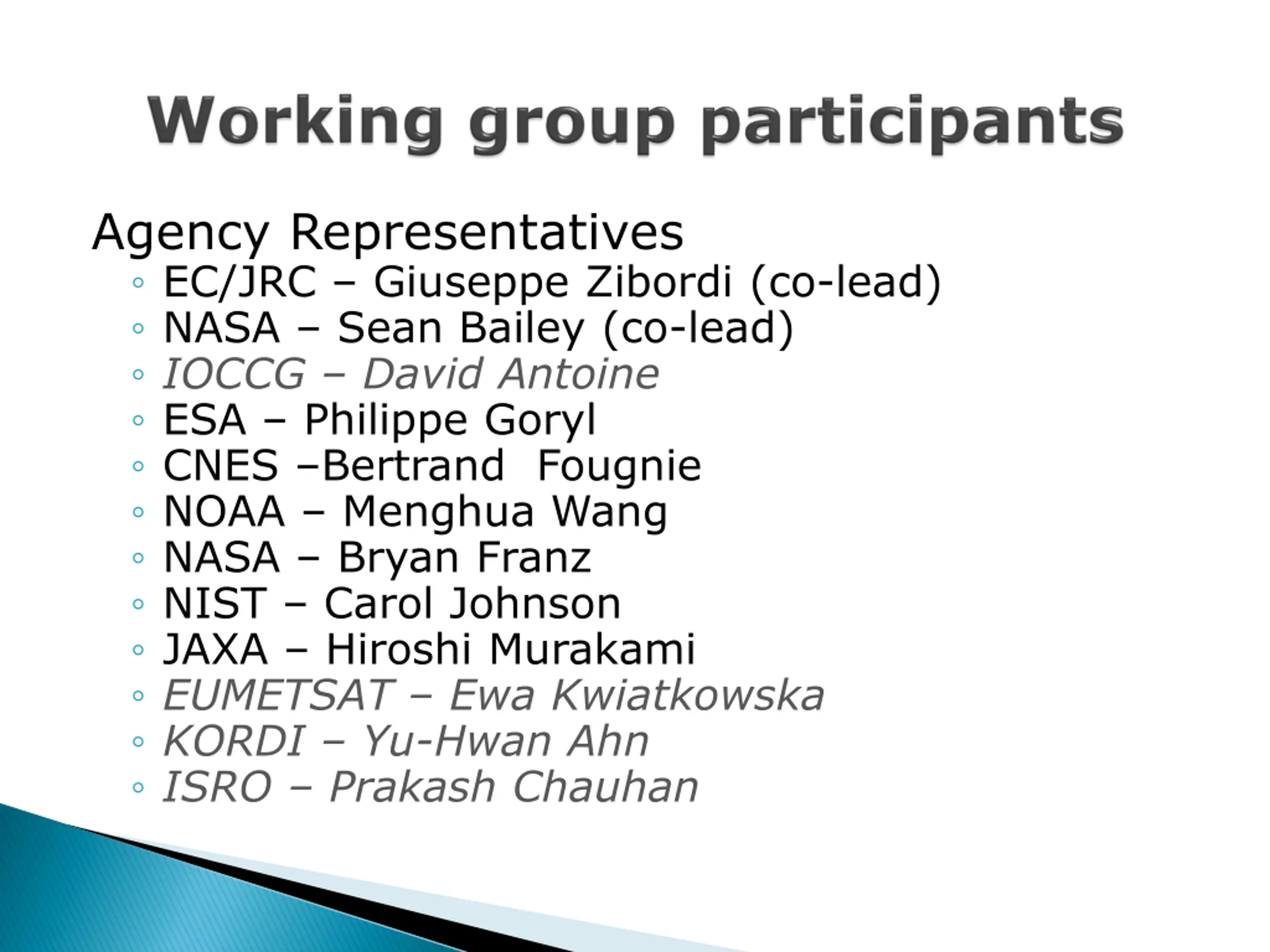 Agency Representatives EC/JRC Giuseppe Zibordi (co-lead) NASA Sean Bailey (co-lead) IOCCG David Antoine ESA Philippe Goryl CNES Bertrand Fougnie NOAA Menghua Wang NASA Bryan Franz NIST Carol Johnson JAXA Hiroshi Murakami EUMETSAT Ewa Kwiatkowska KORDI Yu-Hwan Ahn ISRO Prakash Chauhan
