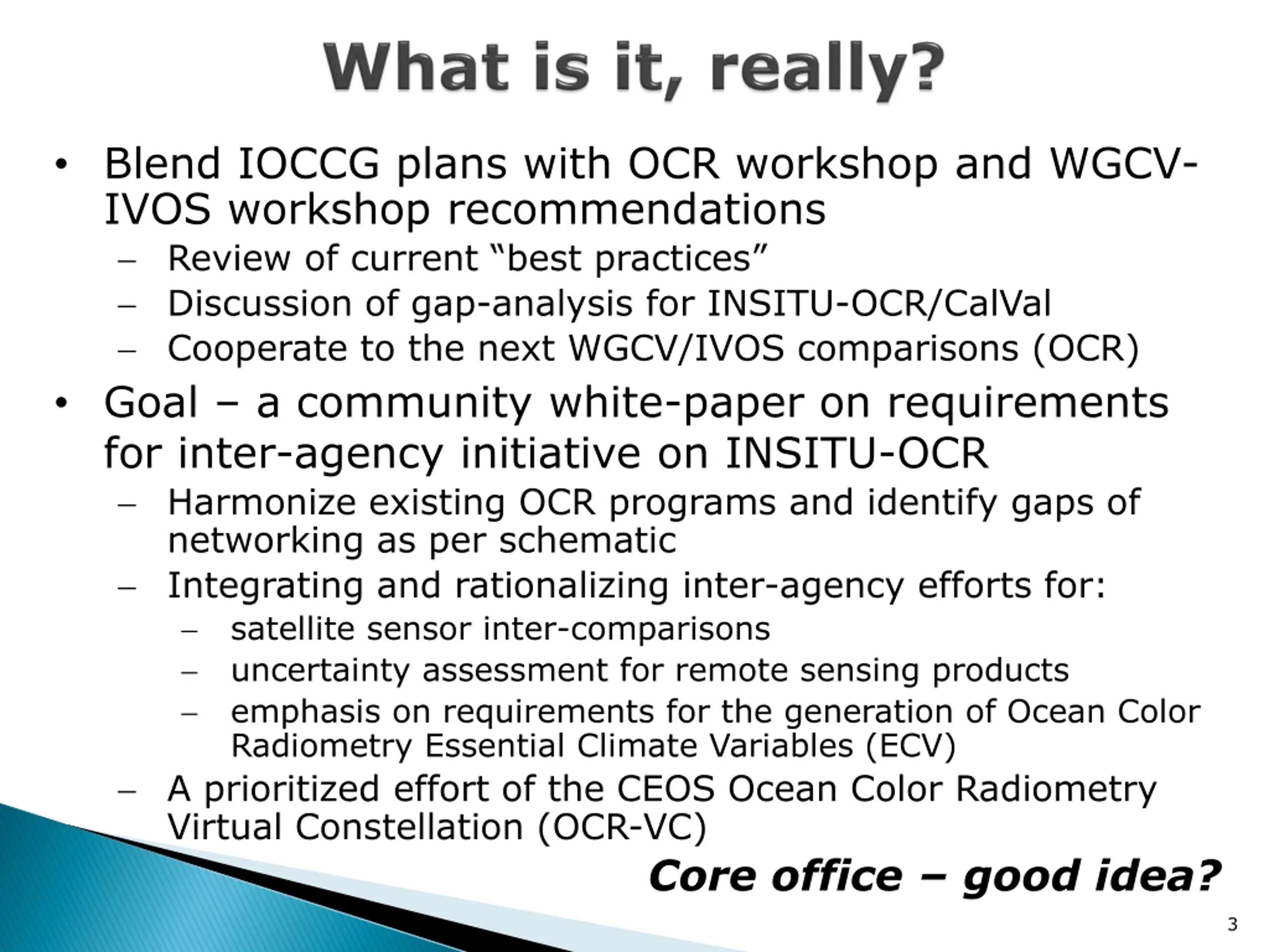 Blend IOCCG plans with OCR workshop and WGCV- IVOS workshop recommendations Review of current best practices Discussion of gap-analysis for INSITU-OCR/CalVal Cooperate to the next WGCV/IVOS comparisons (OCR) Goal a community white-paper on requirements for inter-agency initiative on INSITU-OCR Harmonize existing OCR programs and identify gaps of networking as per schematic Integrating and rationalizing inter-agency efforts for: satellite sensor inter-comparisons uncertainty assessment for remote sensing products emphasis on requirements for the generation of Ocean Color Radiometry Essential Climate Variables (ECV) A prioritized effort of the CEOS Ocean Color Radiometry Virtual Constellation (OCR-VC) Core office good idea? 3