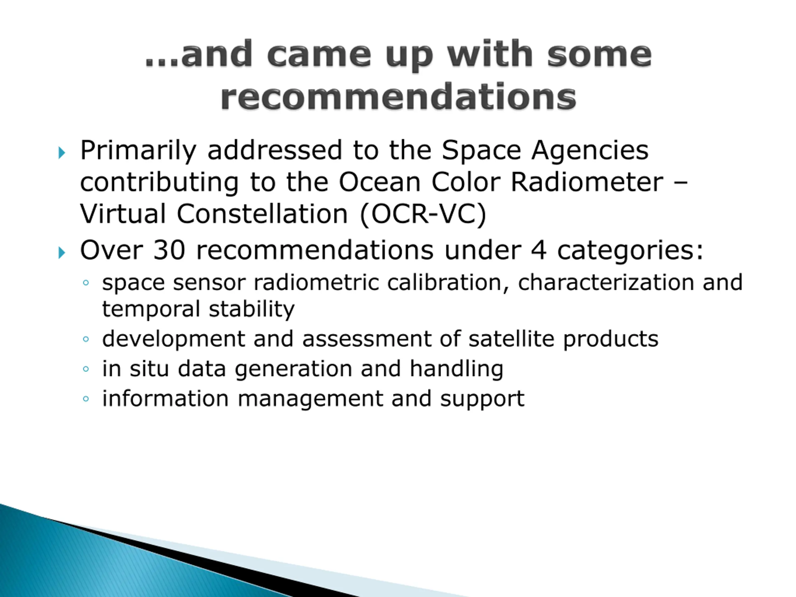 Primarily addressed to the Space Agencies contributing to the Ocean Color Radiometer Virtual Constellation (OCR-VC) Over 30 recommendations under 4 categories: space sensor radiometric calibration, characterization and temporal stability development and assessment of satellite products in situ data generation and handling information management and support