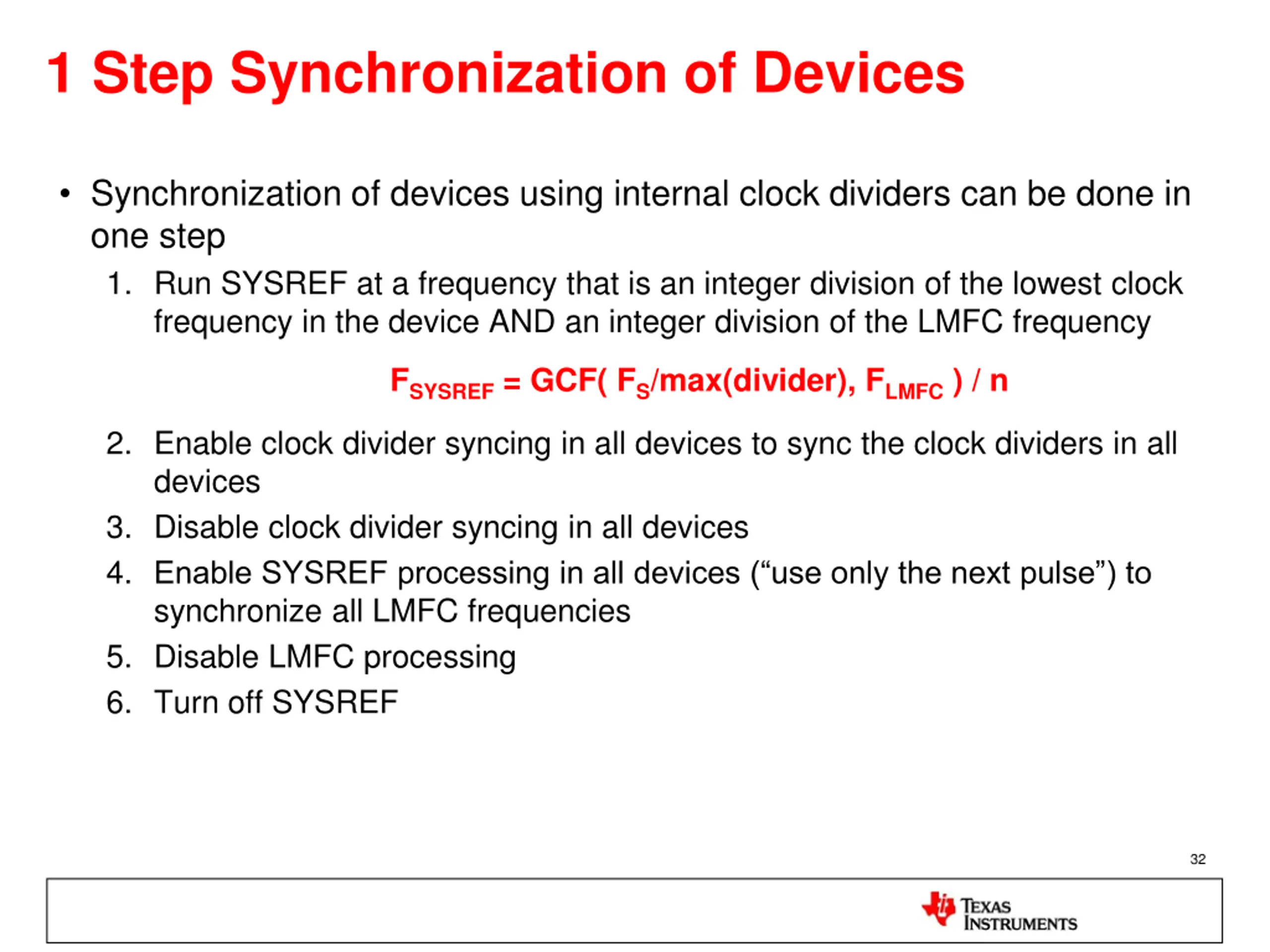 2 Step Synchronization of Devices Synchronization of devices using internal clock dividers can be done in using a two step process 1. Synchronize the clock dividers in all devices 1. Run SYSREF at a frequency that is an integer division of the lowest clock frequency in the device FSYSREF = FS / max(divider) / n 2. Enable clock divider syncing in all devices to sync the clock dividers in all devices 3. Disable clock divider syncing 2. Synchronize LMFCs in all devices 1. Set the SYSREF frequency to an integer division of the LMFC frequency FSYSREF = FLMFC / n 2. Enable SYSREF processing in all devices to synchronize all LMFC frequencies 3. Disable LMFC processing 4. Turn off SYSREF 31