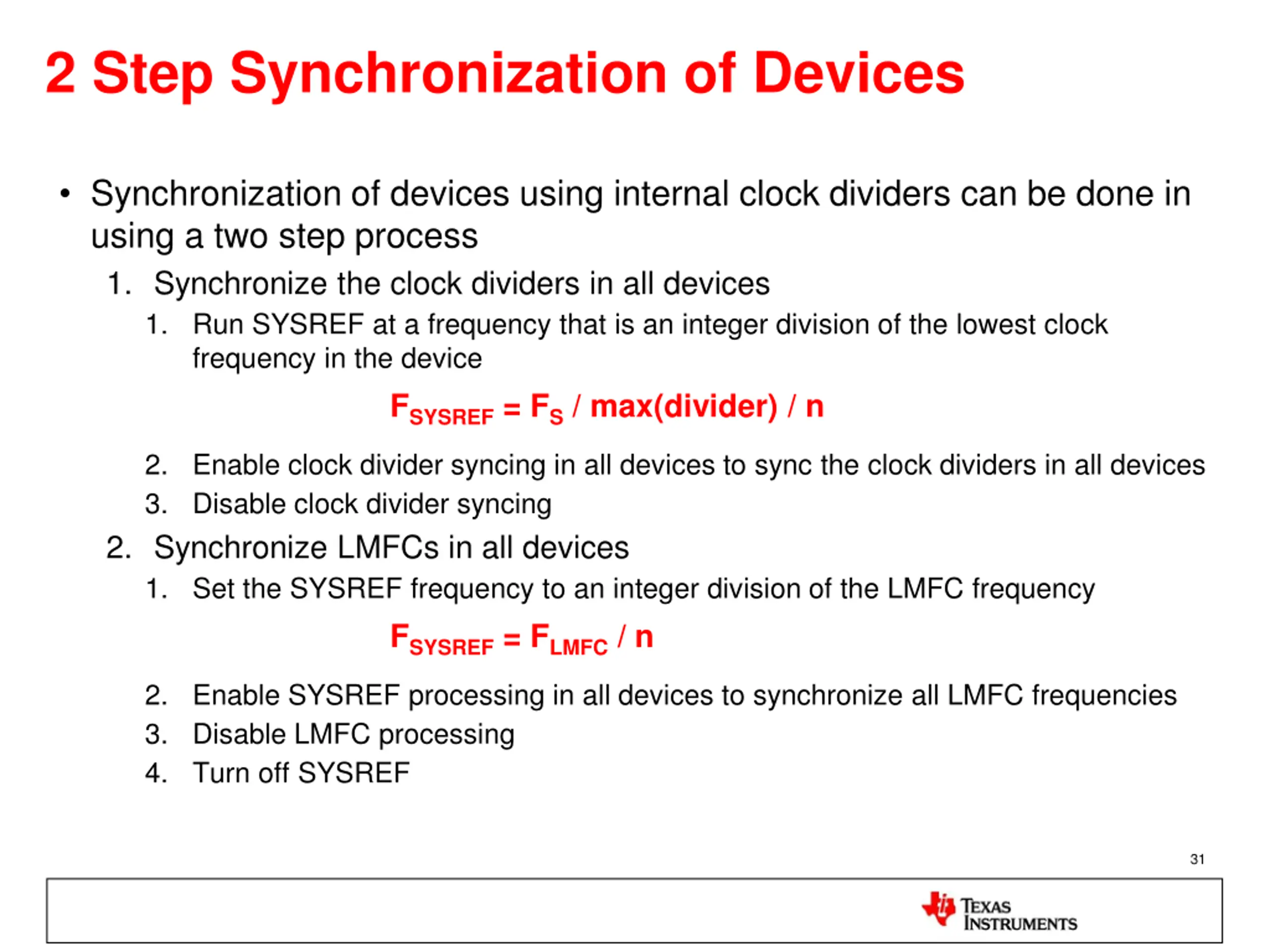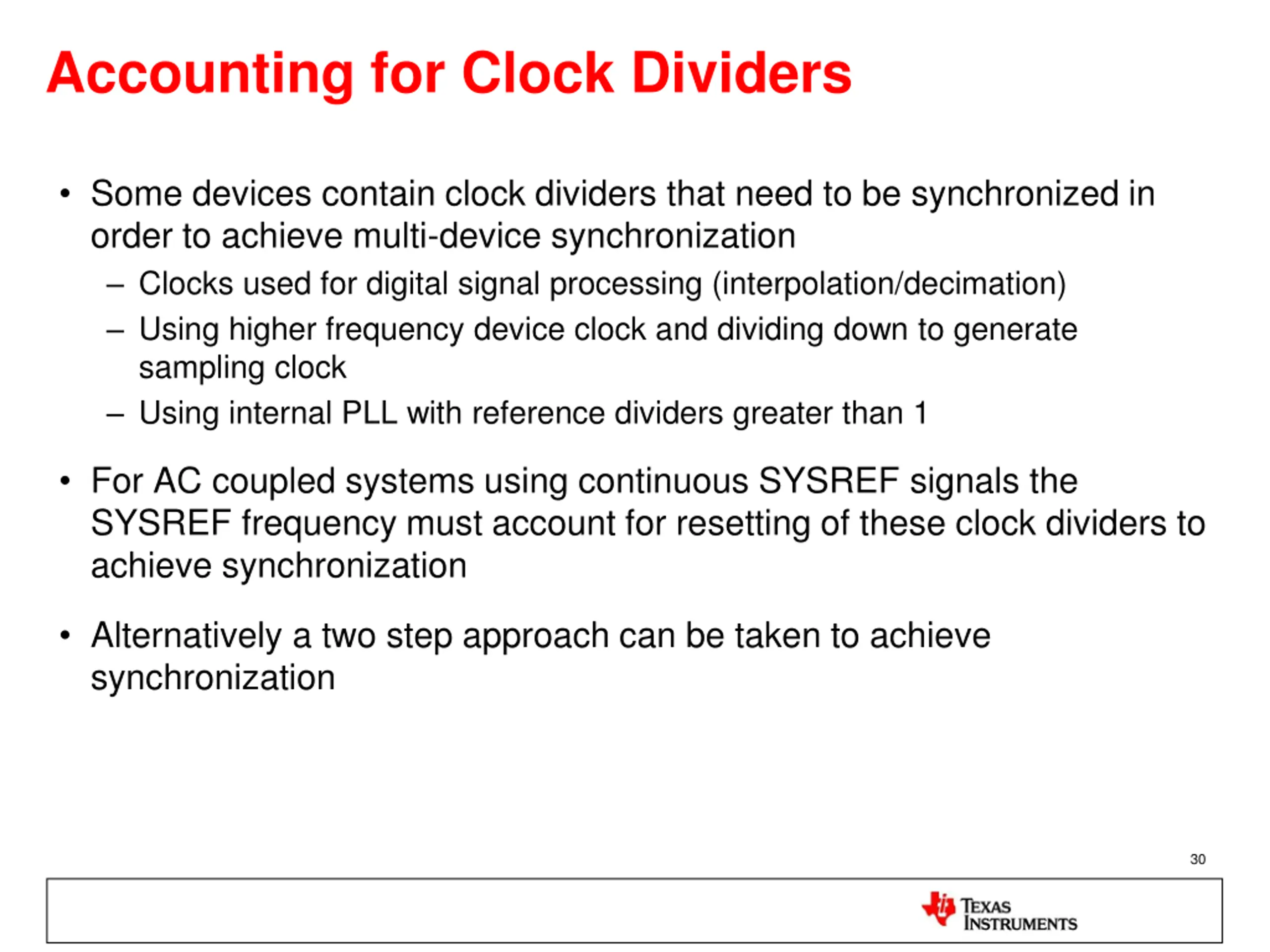 Accounting for Clock Dividers Some devices contain clock dividers that need to be synchronized in order to achieve multi-device synchronization Clocks used for digital signal processing (interpolation/decimation) Using higher frequency device clock and dividing down to generate sampling clock Using internal PLL with reference dividers greater than 1 For AC coupled systems using continuous SYSREF signals the SYSREF frequency must account for resetting of these clock dividers to achieve synchronization Alternatively a two step approach can be taken to achieve synchronization 30